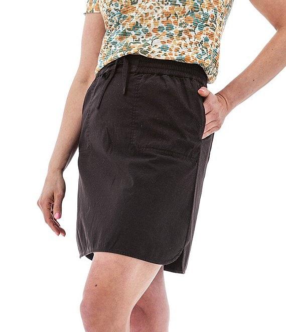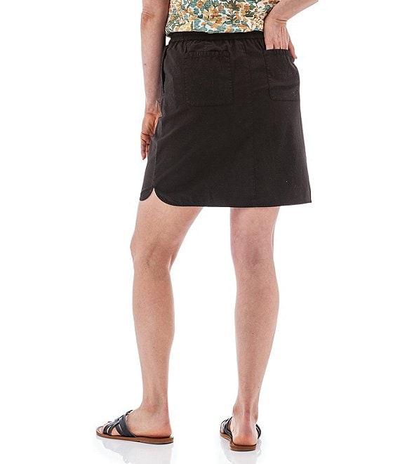 From Aventura, this skirt features: Peach plain weave woven fabrication A-line silhouette Drawstring elastic waistband Two front pockets Two back drop-in pockets Curved side slit hemline Pull-on construction Approx. 19" length Organic cotton/spandex Machine wash Imported.
