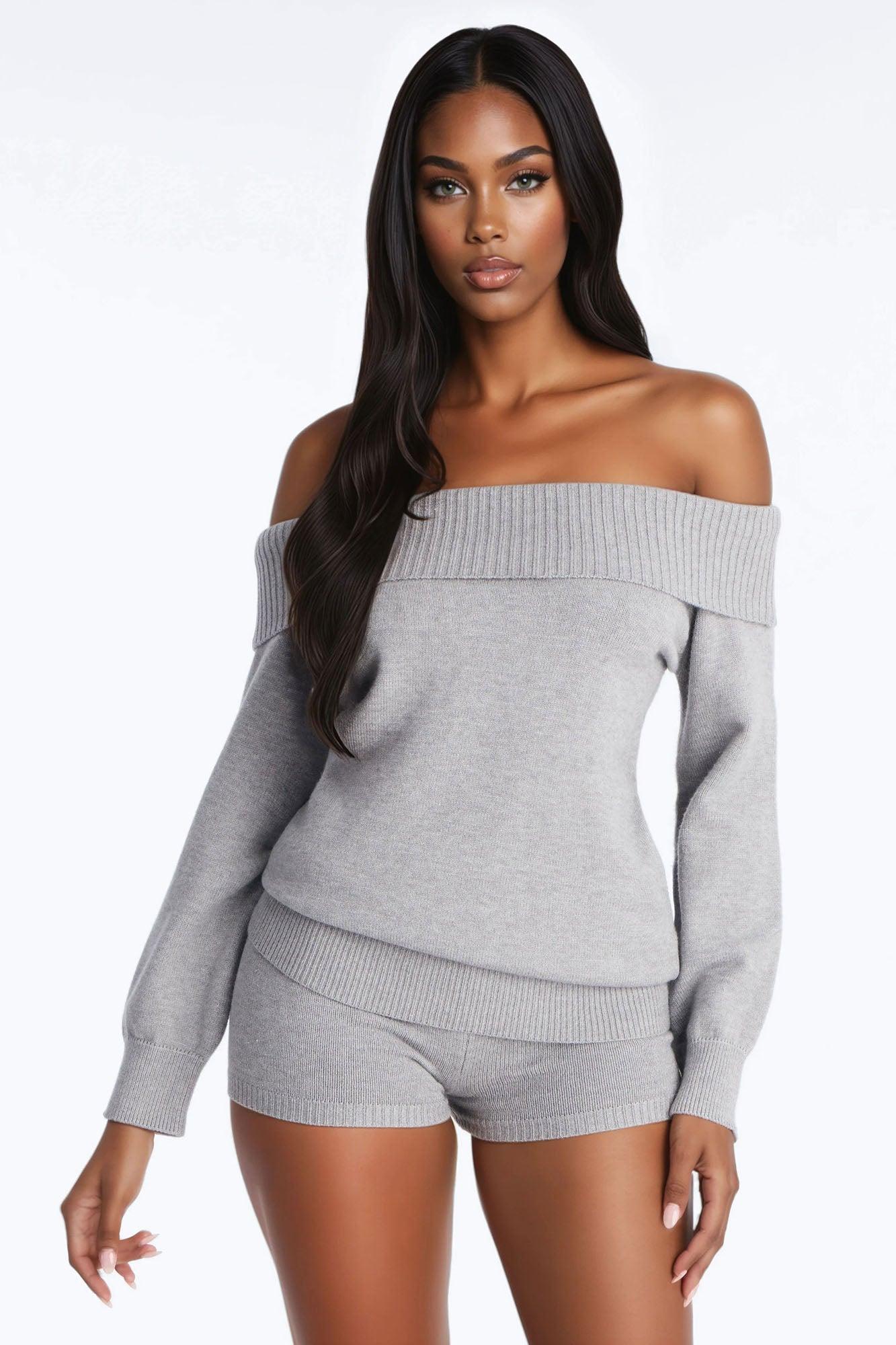 Avery Sweater 3 Piece Short Set - Grey Female