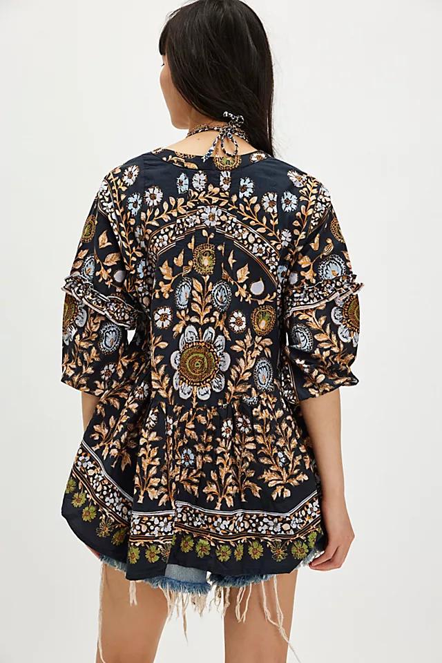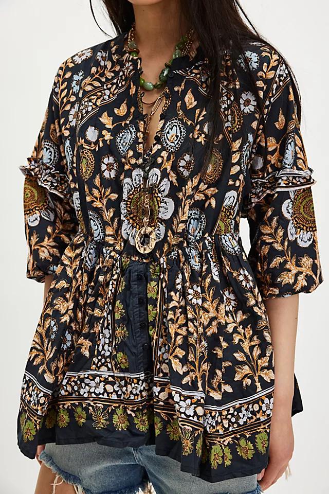 There’s nothing minimal about this statement tunic, featured in a voluminous design with ¾ length puff sleeves, a cinched waistline, and buttons down the front.
