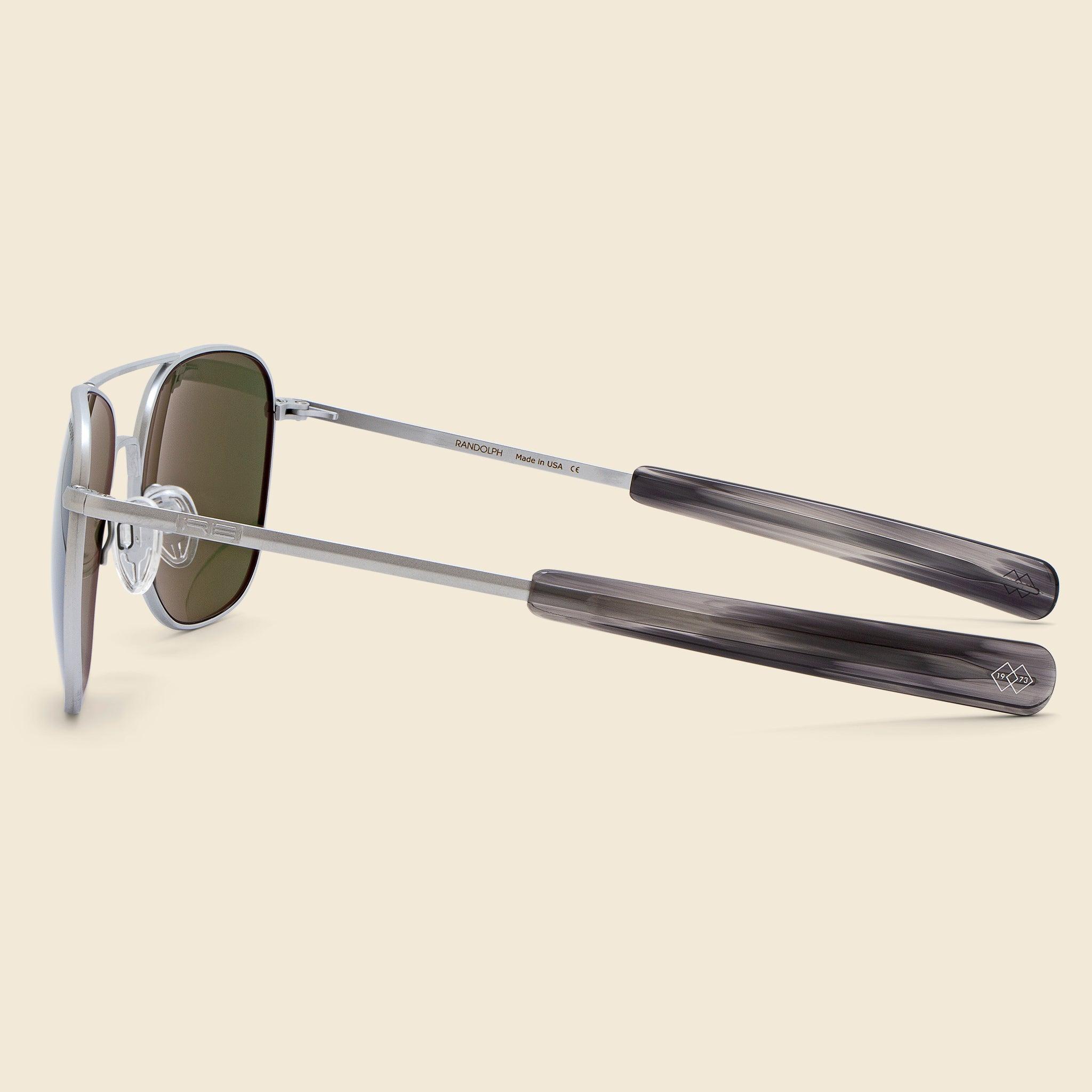 Designed for the individualist and engineered for the extraordinary, the Aviator from Randolph Engineering is the epitome of American-made. Standard issue for the US Military since 1982, each pair surpasses rigid military-spec standards year after year to remain the frame of choice by those who demand the best. Each pair takes six weeks to make and is handcrafted from start to finish, with the end result being a pair of sunglasses that are built to last, battle-tested, and known in the industry as ‘the Tank’. Designed and handcrafted in Massachusetts over a 6-week period and 200+ steps Military issued: HGU4/P, MIL-S-25948 High-performance lens with a 'relaxing' green base, selectively highlighting soothing green/yellow wavelengths, with a subtle deep blue iridescent mirror finish Polarized glare prevention with 100% UVA/UVB protection SkyTec Mineral Glass with Vector Anti-Reflective & Blue Wave lens technology Signature bayonet temples designed for fighter pilots Jewelry-quality finishes with durability coating to prevent scratches Guaranteed for life against manufacturer’s defects Adjustable cushioned silicon nose pads for a customized fit Each pair includes a genuine embossed hard case & microfiber cleaning cloth Compliments all face shapes Measurements: Bridge Width: 15mm | Lens: 52mm | Arm Length: 140mm
