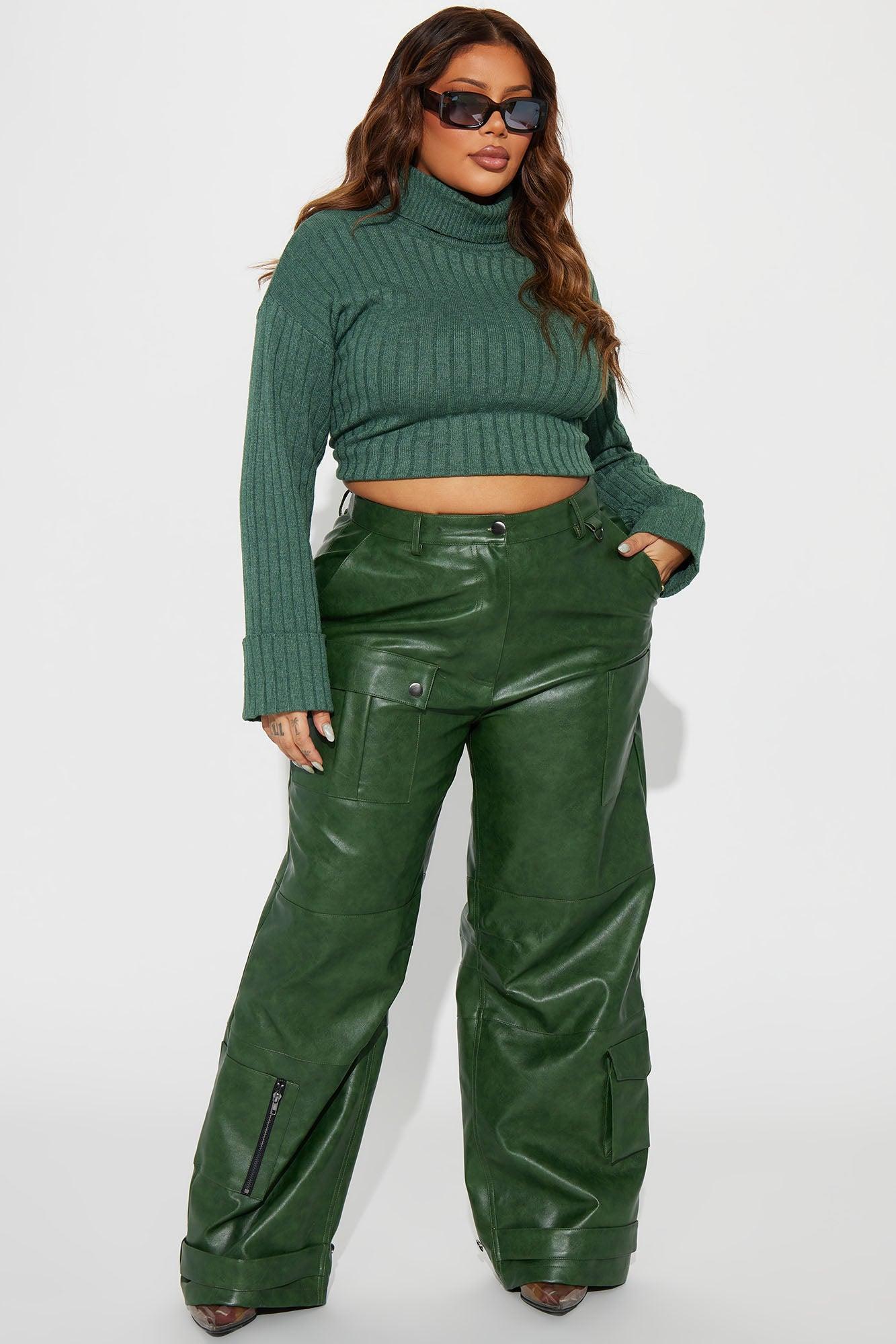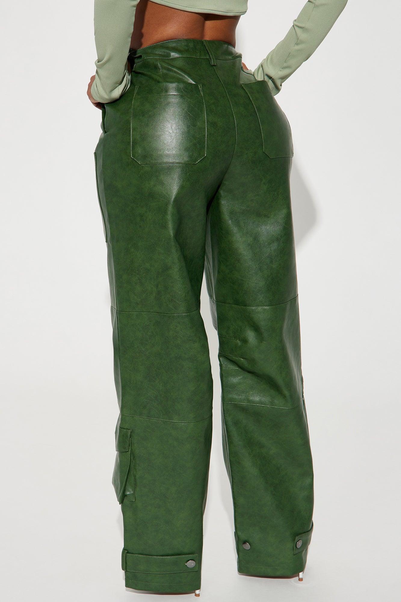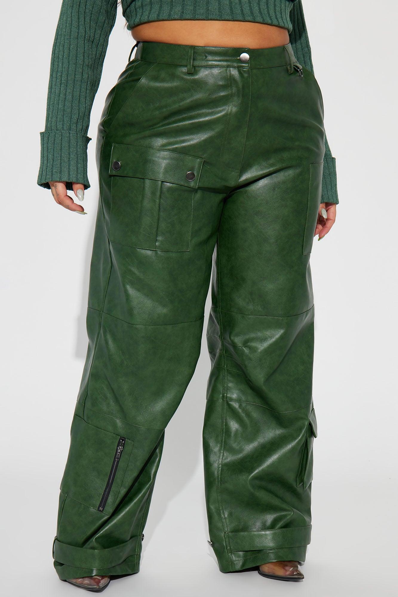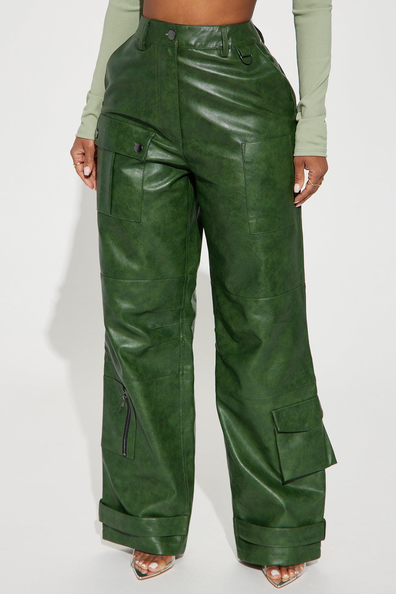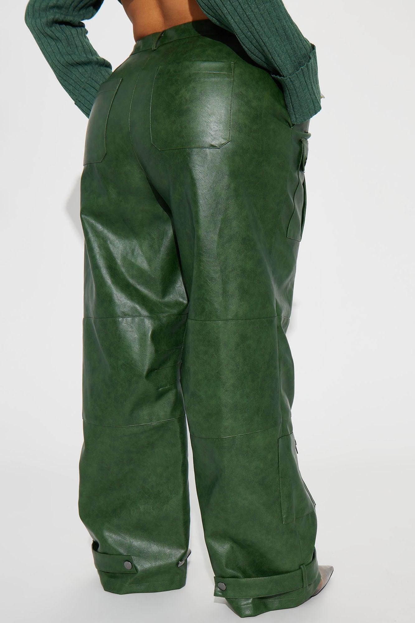 Available In Hunter. Cargo Pant High Rise Button & Zipper Closure Cargo Pockets Wide Leg Washed Faux Leather Non Stretch Disclaimer: Due To The Specialized Wash Process, Each Garment Is Unique. Coating: 100% Polyurethane Base Fabric/Lining: 100% Polyester Imported