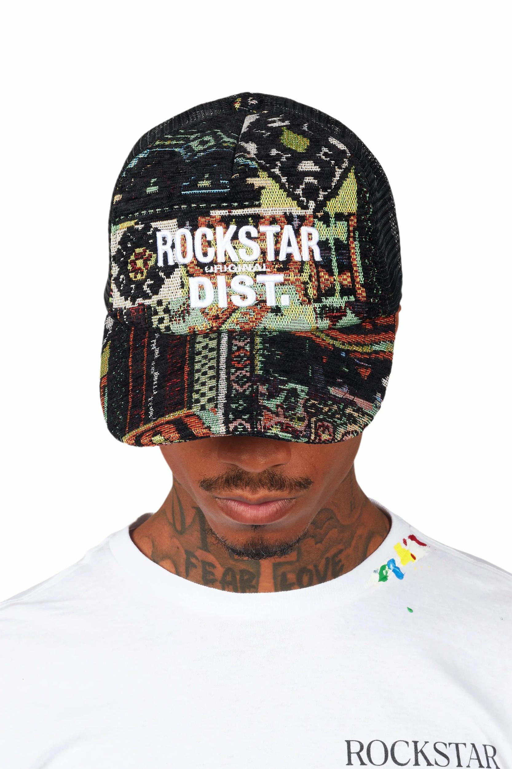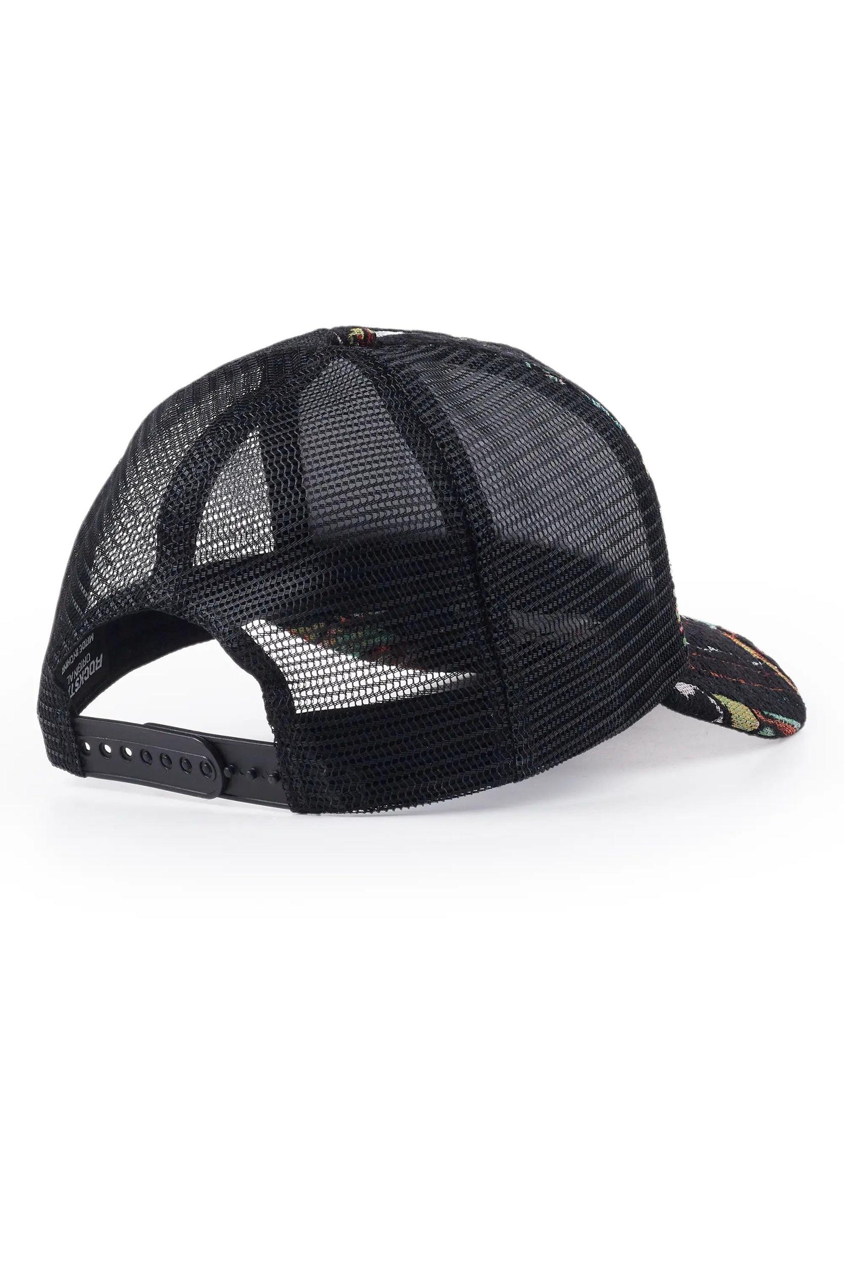 A light-structured trucker hat for men in green tapestry. Designed with mesh backing and a traditional ball-cap fit for a versatile accessory. Adjustable snapback closure Moisture-wicking sweatband Soft mid-crown height Embroidered RSO logo Custom tapestry fabric
