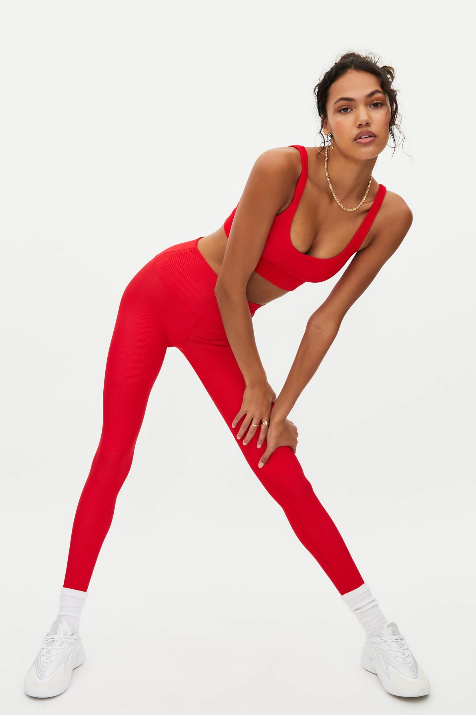 The Ayla Legging in Red features an ultra, high waisted thick waistband holds you in and keeps you compressed for a roll-free workout and the ribbed fabric makes them even softer. The slimming silhouette with long rib lines will surely become a staple in your wardrobe. Polyester/Lycra Blend Hand wash cold; lay flat to dry Made in the USA Model is wearing Size Small Inseam for size small is 26 5/8"