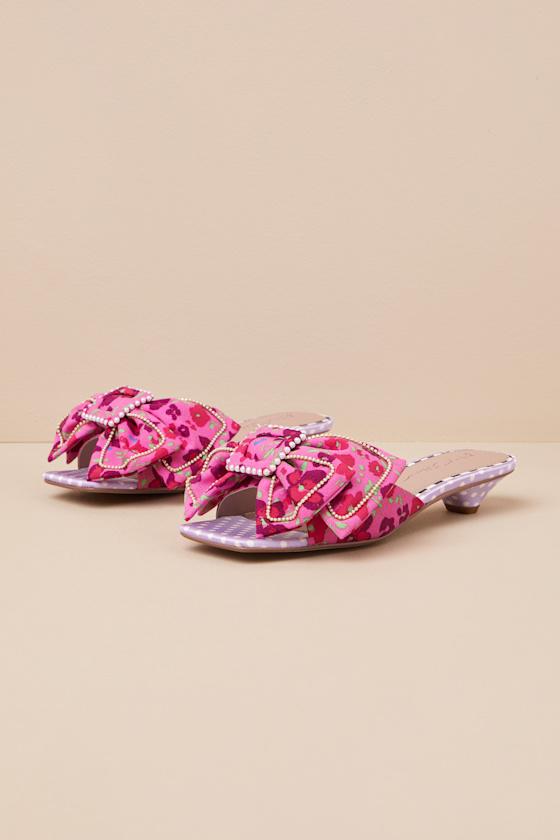 Things can't get any more fun than these funky printed kitten heels by Betsey Johnson, which are a natural at being the center of attention. Sleek satin shapes the square footbed, featuring a cutesy polka dot pattern and a wide, floral toe strap, adorned with a layered bow and a pearl-trimmed buckle.