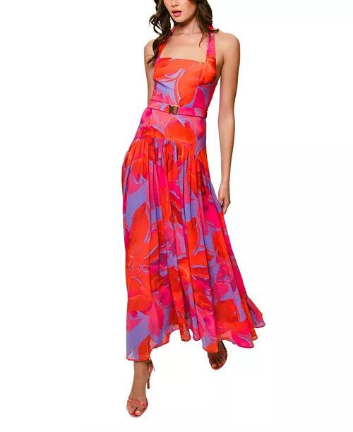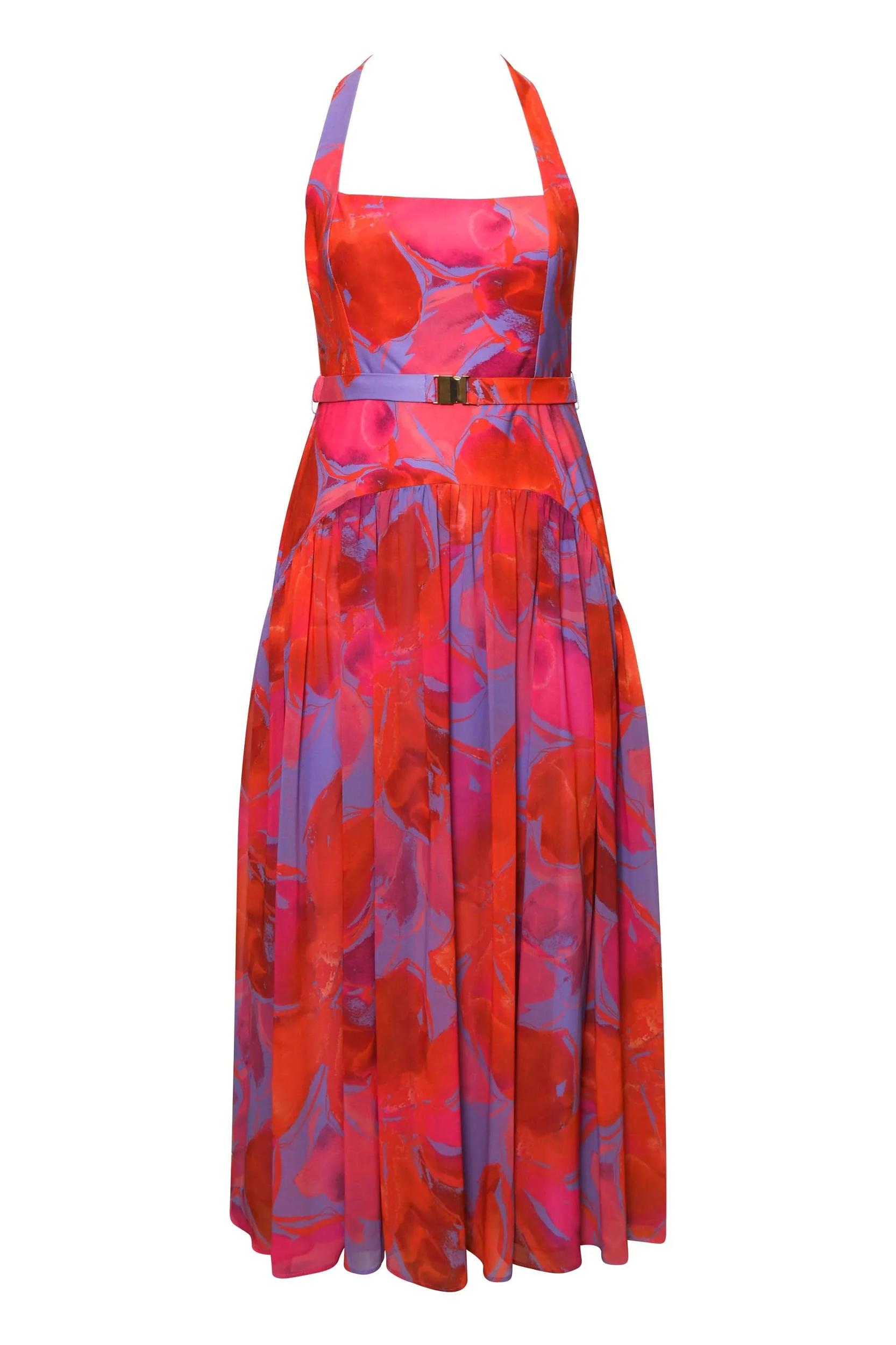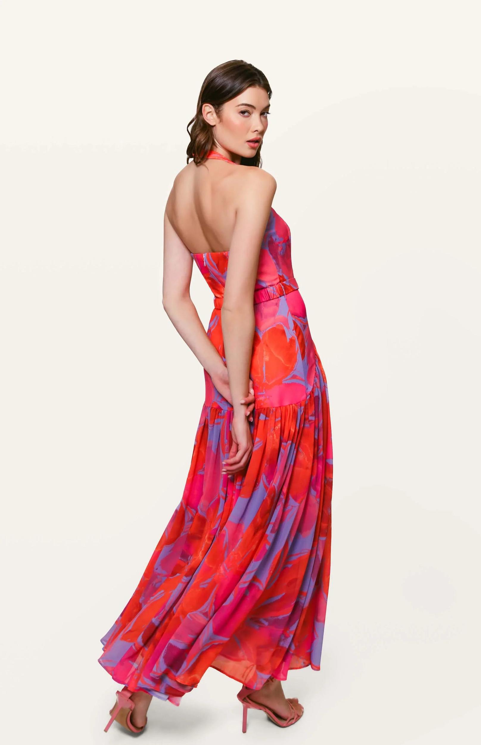 Turn heads in the Aza Dress! This playful halter maxi dress features a trendy drop waist and detachable belt for a customizable fit. The combination of stretch crepe and chiffon adds a touch of luxury, while the center back zipper and lining ensure easy wear. Perfect for special occasions, dry clean only.