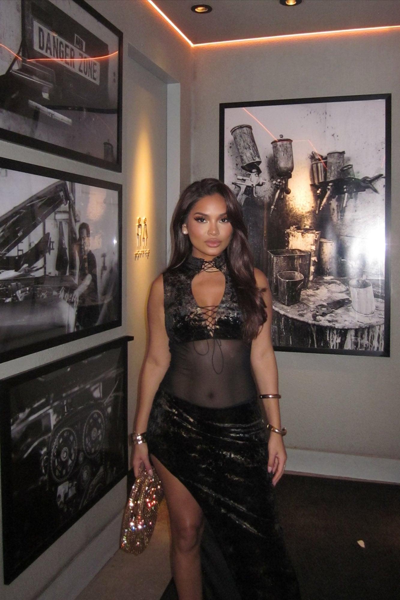 Available In Black/combo. Velvet Maxi Dress Metallic Snake Skin Detail Sleeveless Mock Neckline Cut Out Lace Up Details Mesh Cut Out Slit Lined Imported Self: 95% Polyester 5% Spandex Contrast: 95% Nylon 5% Spandex Lining: 100% Polyester Stretch