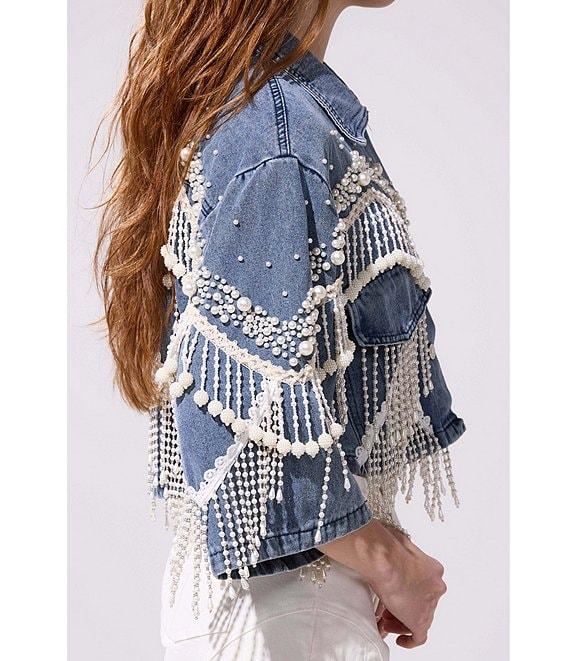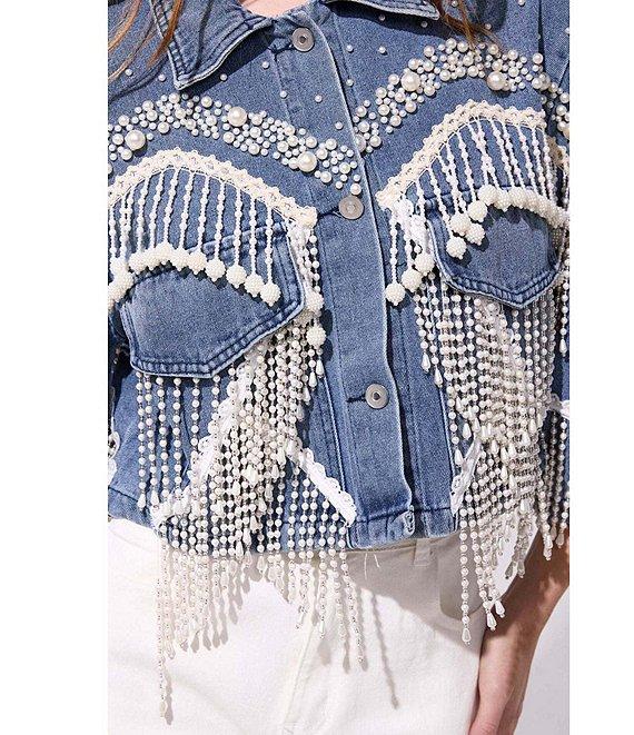 From Azalea Wang, this jacket features: Denim fabrication Cropped silhouette Point collar neckline Wide long sleeves Two chest pockets Pearl detail Relaxed fit Straight hemline Button front closure Approx. 19.5" length Cotton/polyester Hand wash Imported.