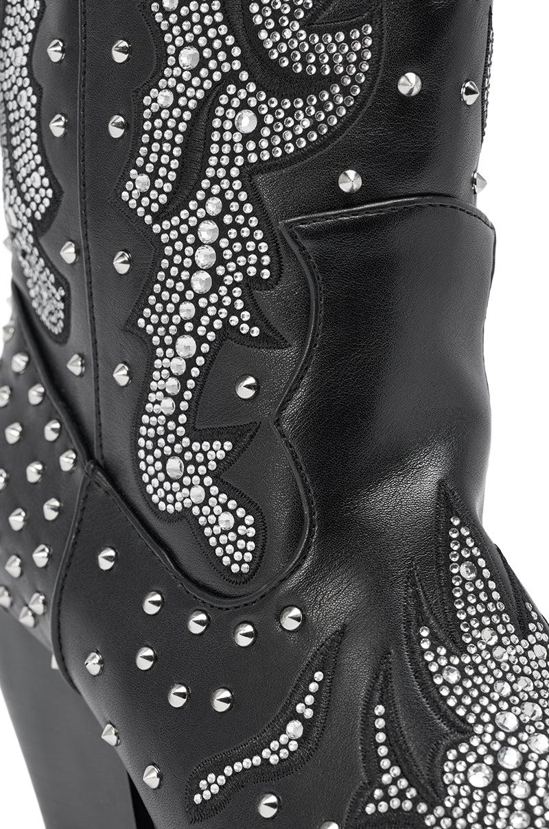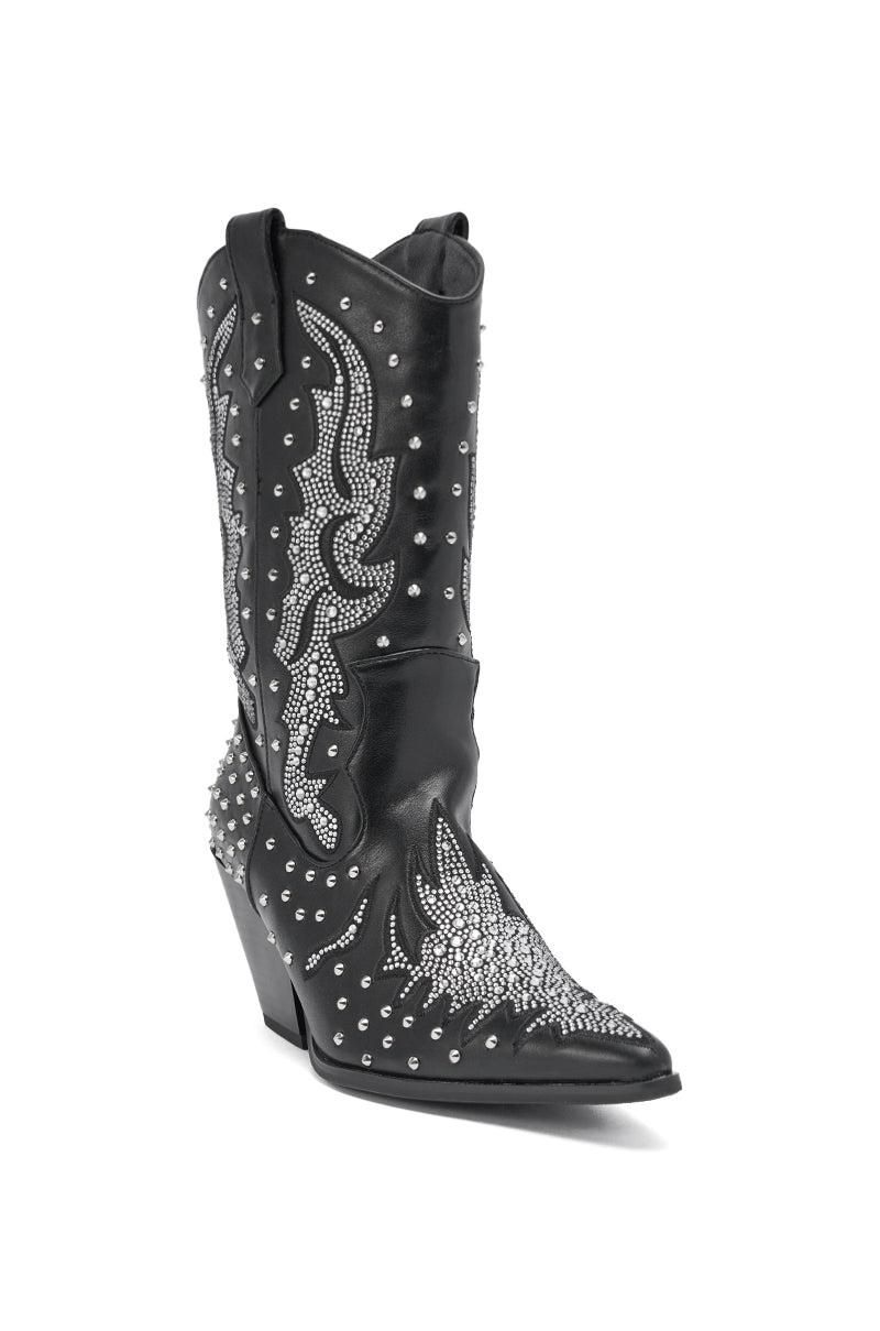 Rhinestoned rodeo ready! The AZALEA WANG Ankus Black Western Rhinestone Boot brings bold attitude with its dazzling rhinestone embroidery and allover silver spiked detailing that combine classic cowboy style with rock-chic glamour. Featuring a pointed toe, sturdy angled block heel, pull tabs and mid-calf height, these statement boots are made from a sleek black faux leather that gives stand-out flair. Throw these on with your favorite black jean shorts for your next country concert! - Faux Leather Upper- Pointed Toe - Chunky Heel- Mid-Calf Shaft- No Stretch- Imported (all measurements are approximate from size 7.5)- 3.25” Heel- 10” Shaft Height - 15” Shaft Opening CircumferenceProduct ID: 1080020