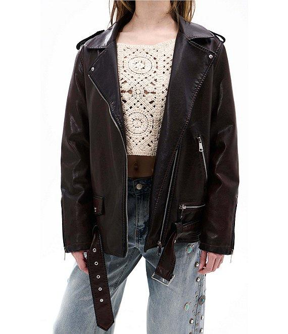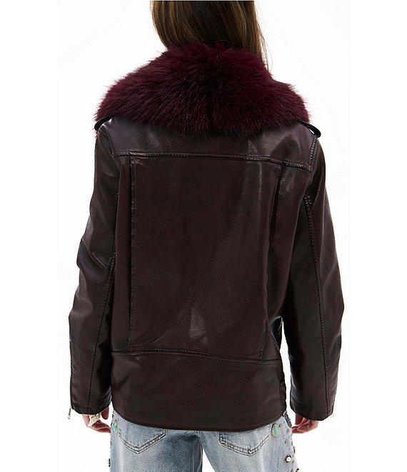 From Azalea Wang, this jacket features: Moto silhouette Removable faux fur trim Shawl collar neckline Long sleeves Front zip pockets Belted Mid weight Casual fit Fully lined Straight hemline Zip front closure Approx. 29" length Polyurethane/viscose/polyester; lining: polyester Wipe with damp cloth for cleaning Imported.