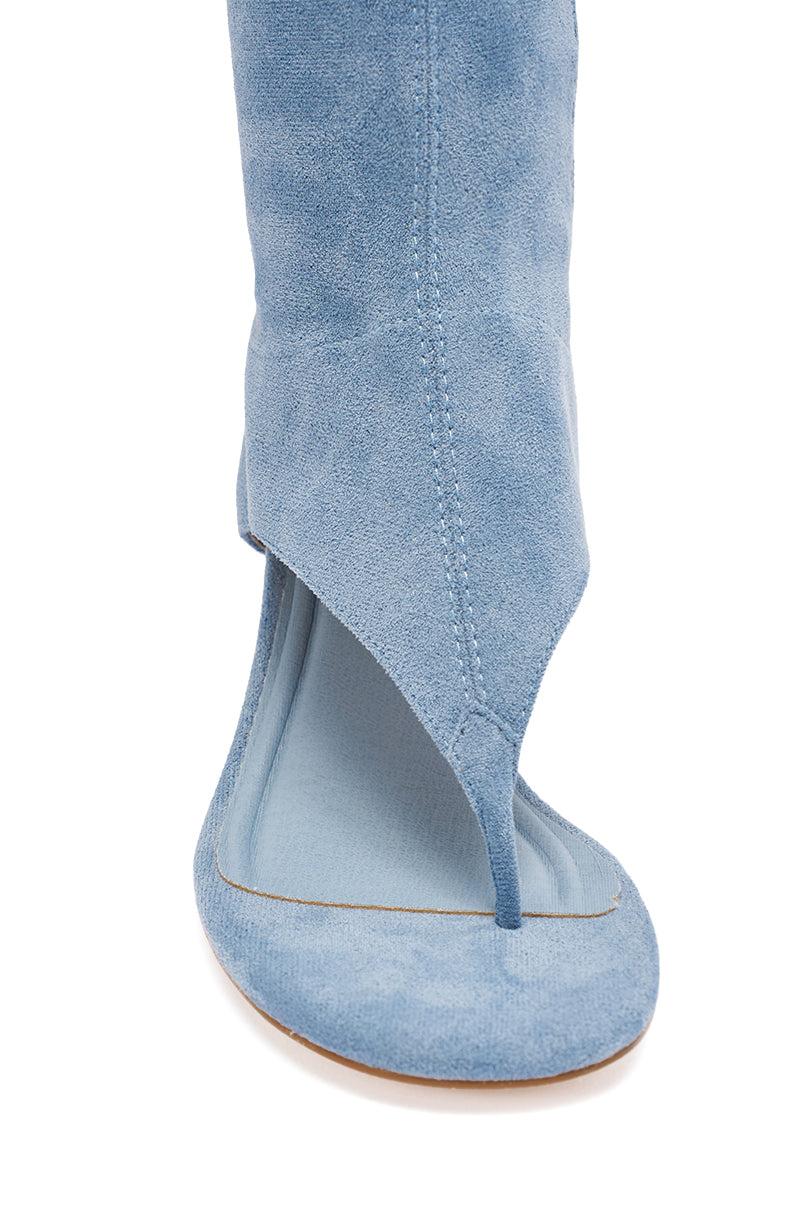 Stepping out in suede! The AZALEA WANG Cecile Light Blue Faux Suede Sandal features a soft suede-like finish, sleek mid-height heel, Comfort Cushion insole, side zipper enclosure with silver hardware, and trendy extended sock-style shaft. Designed with a modern thong silhouette with cutouts for an elegant, minimalist touch, this statement shoe blends sophistication and comfort, making it perfect for dressing up nights out, special events, and standout street-style moments. - Faux Suede Upper- Square Thong Toe- Short Stiletto Heel- Knee-High Shaft- Slight Stretch- Imported (all measurements are approximate from size 7.5)- 2.5” Heel- 13.5” Shaft Height (highest point)- 13.5” Shaft Opening Circumference- 12.5” Shaft Opening CircumferenceProduct ID: 1078859