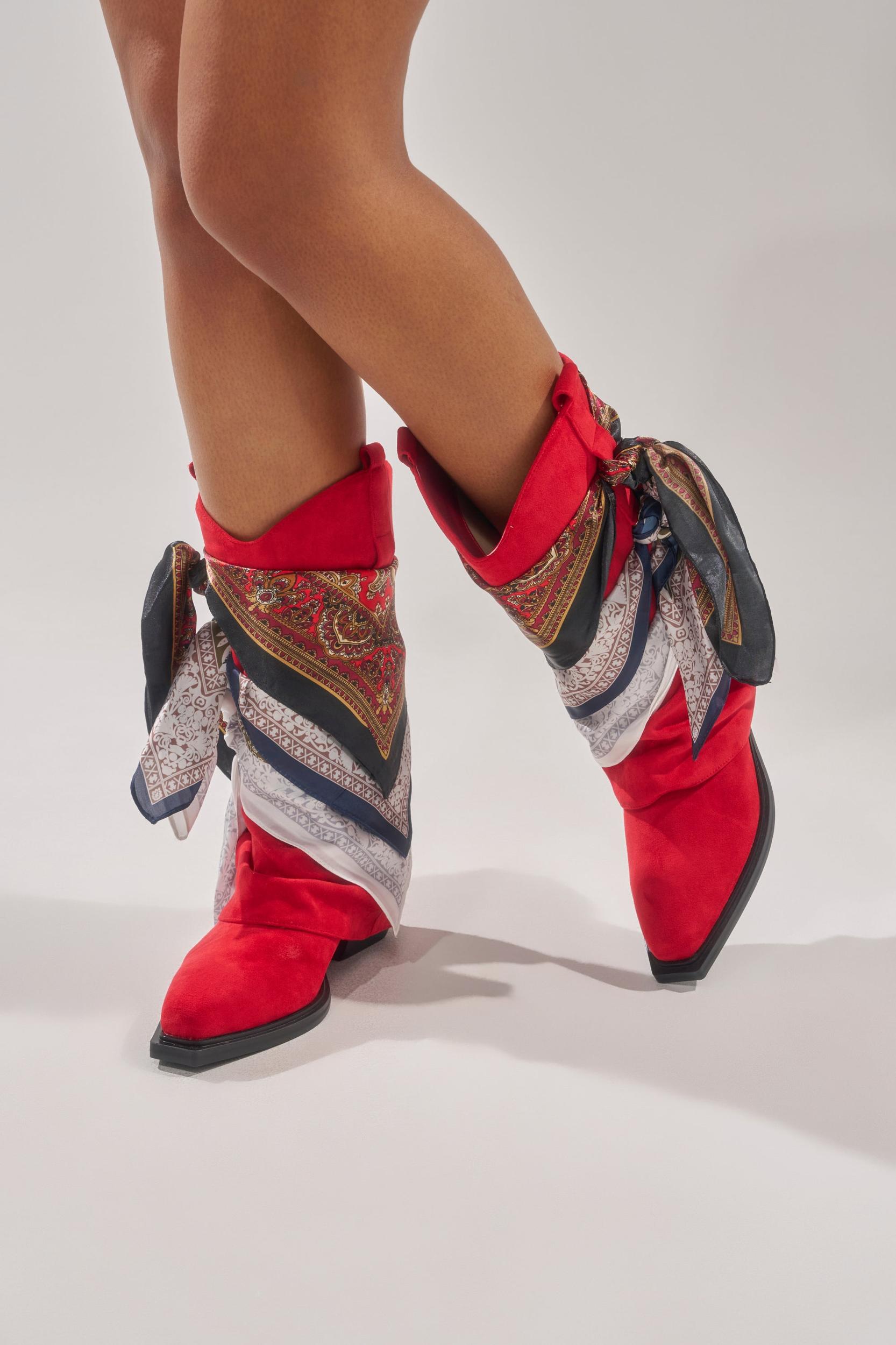 Kick up dust in sheer style. The AZALEA WANG Cobalt Red Faux Suede Scarf Embellished Western Bootie is crafted from a sumptuous faux suede in a ruby red colorway. It features a pointed toe, a chunky stacked heel, and a mid-calf fold over shaft wrapped in delicate, smooth faux satin scarf detailing with an assortment of prints and patterns. Complete with pull-tabs at the shaft opening for an easy, pull-on fit. - Faux Suede Upper- Pointed Toe- Chunky Heel- Mid-Calf Shaft- Imported (all measurements approximate from size 7.5)- 2.5” Heel Height- 10” Shaft Height- 15” Shaft Opening CircumferenceProduct ID: 1074386