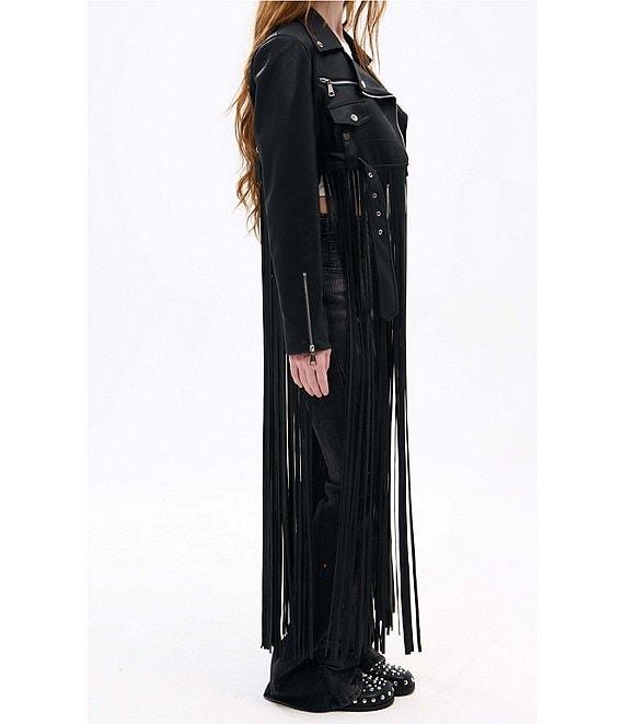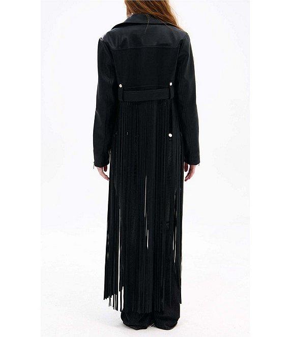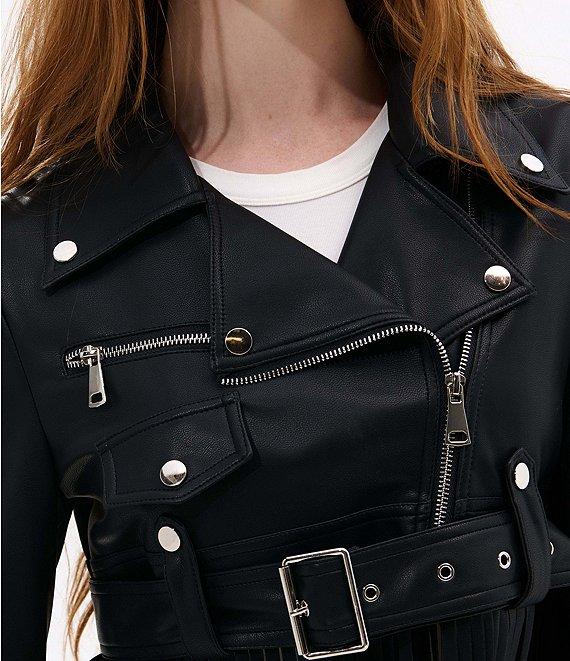 From Azalea Wang, this jacket features: Faux leather fabrication Moto silhouette Notch collar neckline Long sleeves No pockets Belted Fringe detail Midweight Fitted fit Fully lined Straight hemline Zip front closure Polyurethane Dry clean Imported.