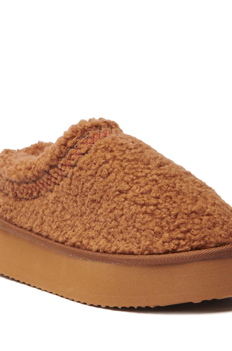 Step into 24/7 comfort with The AZALEA WANG Damari Chestnut Flat. This cozy slipper-inspired shoe is crafted from a snuggly faux sherpa upper and features a round toe silhouette, a foam-like flatform sole, a plush faux fur inner lining, a textured outsole, and a colorful woven design lining the top hem. Complete with an easy, slip-on fit. (all measurements approximate from size 8)- Faux Sherpa Upper- Rounded Toe- Flatform Sole- 1.5” Sole Height- Imported Product ID: 433117