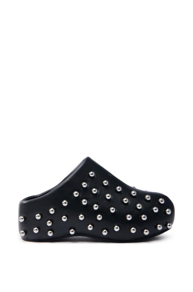 The AZALEA WANG Darwin Stud Flat Clog In Black is brought to you in a luxe, slightly padded vegan leather and boasts an almond toe, a flatform sole, a tonal Comfort Cushion insole, and ornamented with silver metallic circular studs throughout. It’s complete with tonal stitching running down the center, a textured rubber outsole, and an easy, slip-on fit. Pair with all black ensembles for a ravishing finish. (all measurements approximate from size 7.5)- Faux Leather Upper- Almond Toe- Flatform Sole- Imported Product ID: 1028196