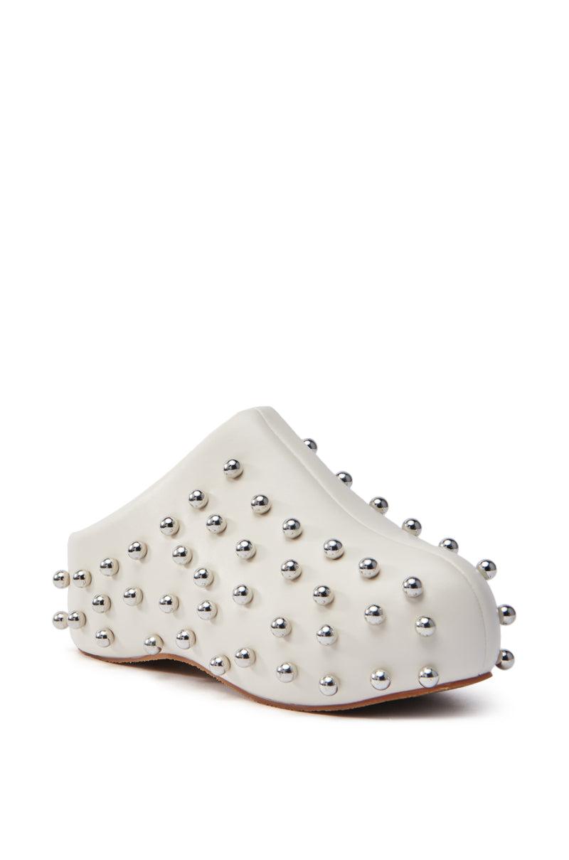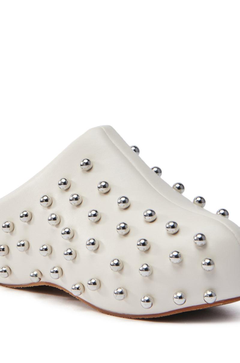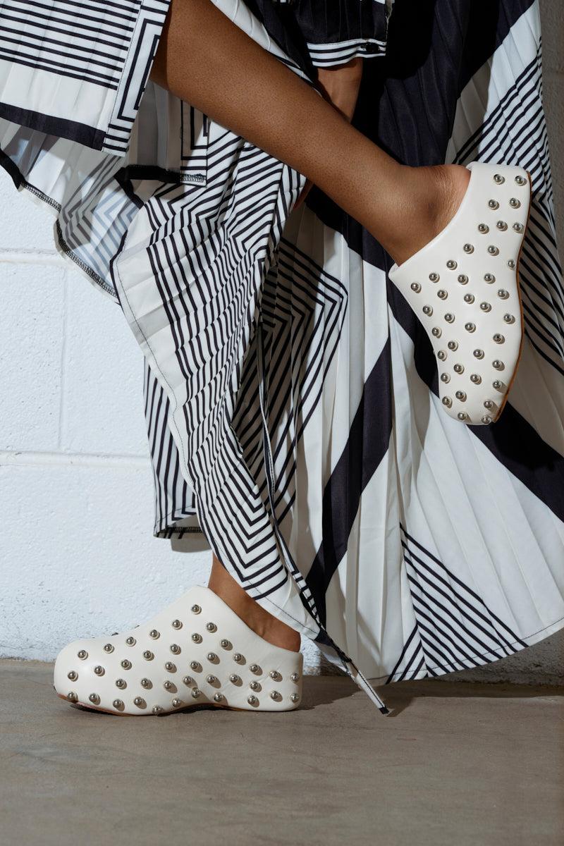 When chic meets modern. The AZALEA WANG Darwin Stud Flat Clog In Bone is crafted from a sleek, slightly padded faux leather and features an almond toe silhouette, a flatform sole, a tonal cushioned insole, tonal seaming running down the center, and adorned with silver metallic circular studs throughout. Complete with a textured rubber outsole, and an easy, slip-on fit. (all measurements approximate from size 7.5)- Faux Leather Upper- Almond Toe- Flatform Sole- Imported Product ID: 1028205