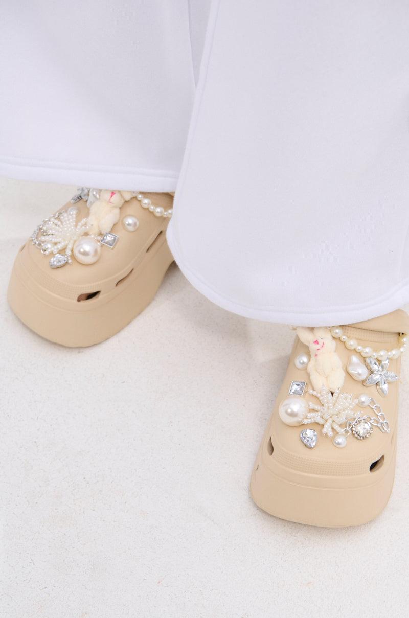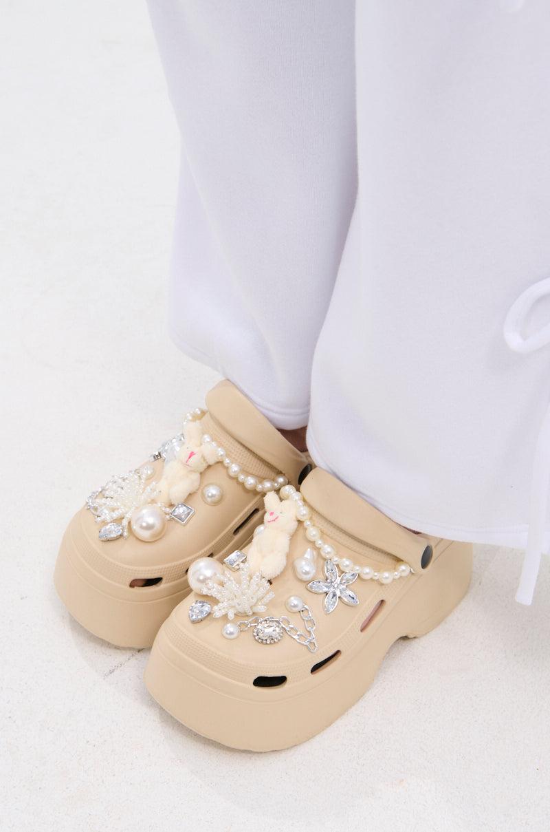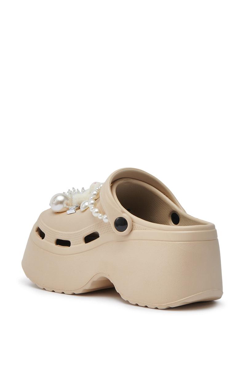 Camp and glamor collide with The AZALEA WANG Davies Beige Embellished Flat. This trendy beige platform clog makes a statement with its eye-catching rhinestone accents, faux pearl details, and playful 3D embellishments including a precious plush bunny charm. The slip-on design features a classic round toe, ventilated sides, and an adjustable heel strap for a secure fit. Equal parts cozy and couture, this shoe is perfect for those who love to keep it comfy while standing out. - EVA Upper- Round Toe- Flatform Sole- Imported Size Conversion: S: BETWEEN 6-7M: 8L: 9 (all measurements approximate from size small)- 2.75” Sole HeightProduct ID: 1040522