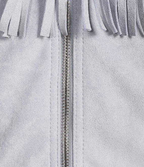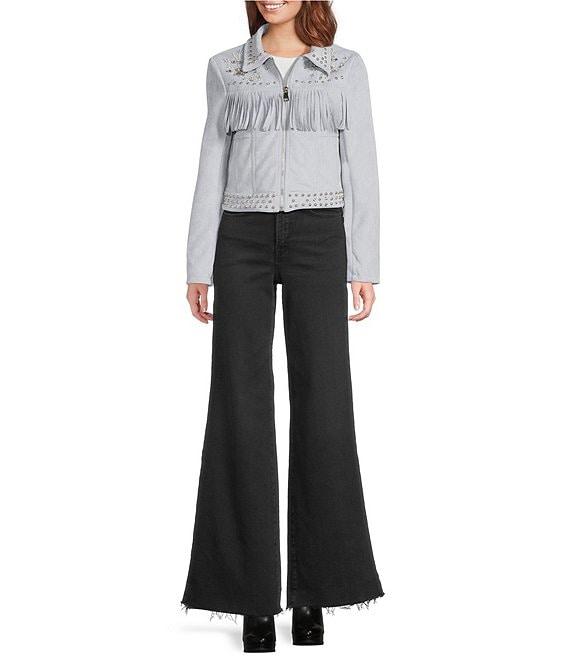 From Azalea Wang, this jacket features: Soft brushed fabrication Denim jean silhouette Point collar neckline Long sleeves Side seam pockets Fringe detail Studded trim Fitted fit Lined Straight hemline Zip front closure Approx. 20" length Polyester Dry clean Imported.