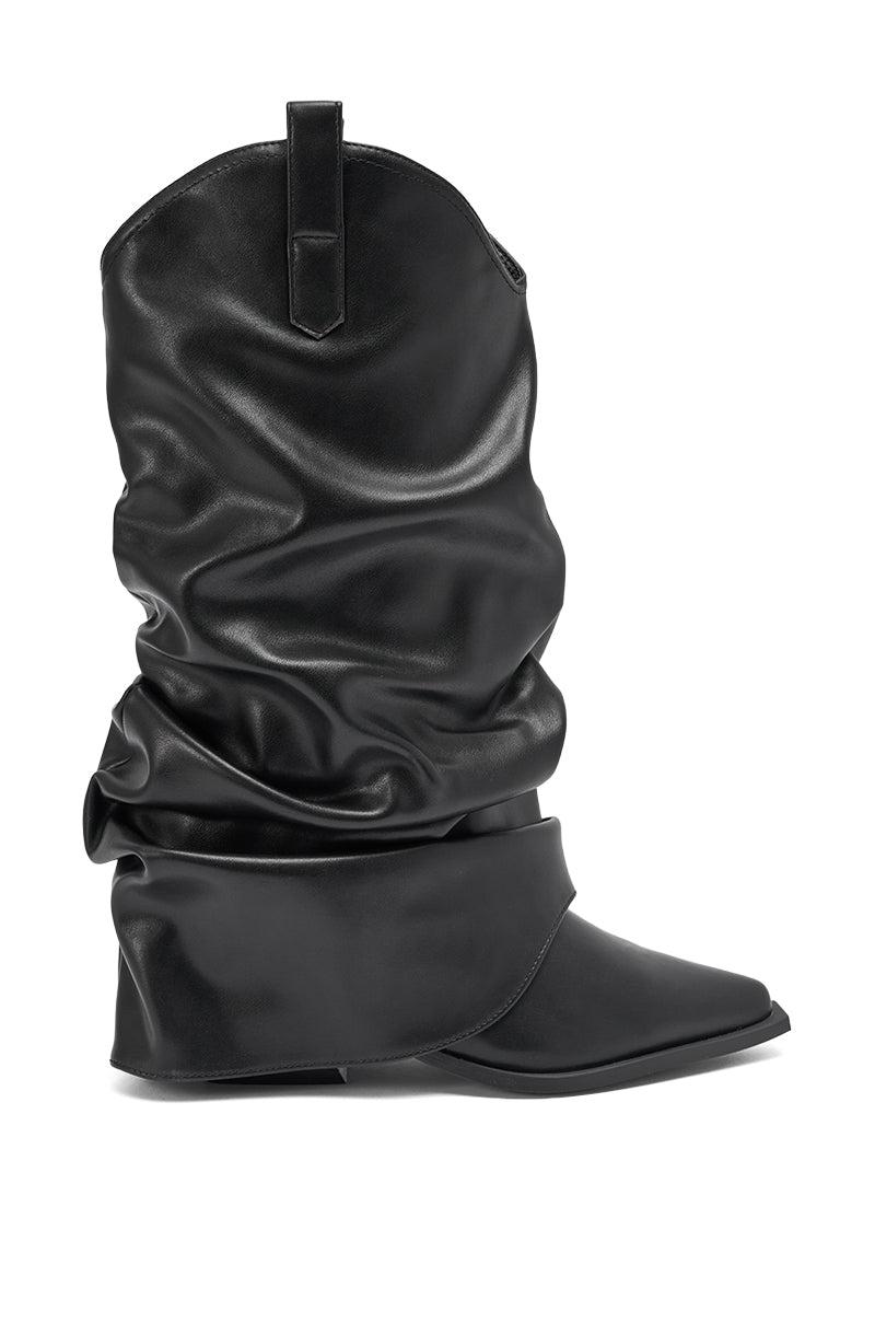 Howdy partner! The AZALEA WANG Hawkston Black PU Ruched Western Bootie is crafted from sleek faux leather and features a pointed toe, a chunky stacked heel, a mid-calf shaft that boasts a slouchy, ruched fold-over design, and a curved shaft opening with pull-tabs. Complete with an easy, pull-on fit. - Faux Leather Upper- Pointed Toe- Chunky Stacked Heel- Mid-Calf Shaft- Imported (all measurements approximate from size 7.5)- 2.75” Heel Height- 12” Shaft Height- 15” Shaft Opening CircumferenceProduct ID: 1080268