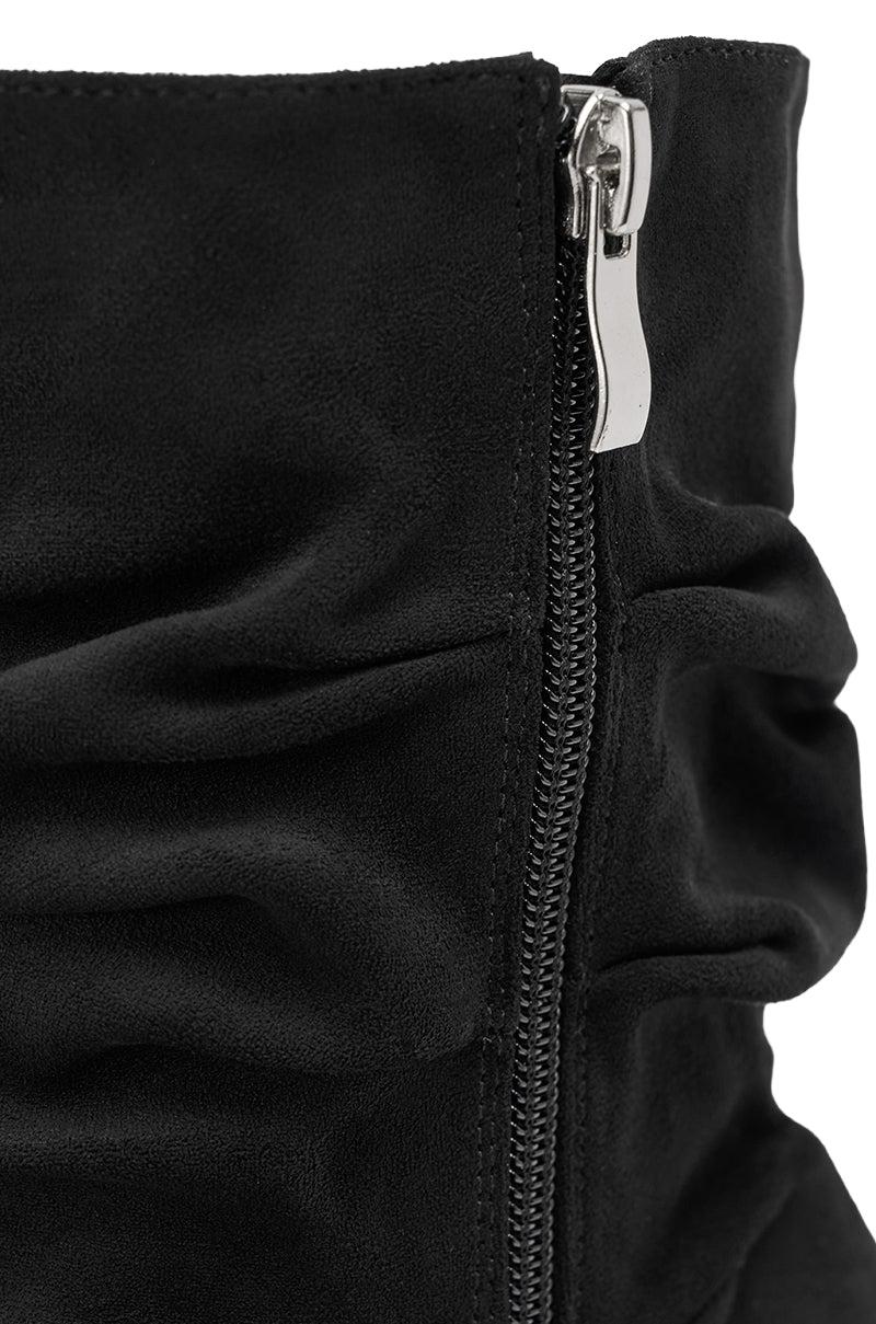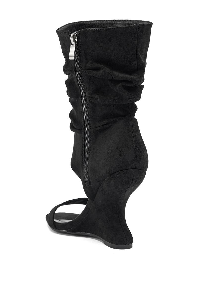 Minimalist slouch boot sandals designed for effortless, modern styling. This sleek black shoe features a faux suede fabric shaft with a relaxed slouch silhouette, paired with an almond open-toe, inverted wedge heel sandal base and a flat sole for all-day comfort. The side zipper enclosure design and Comfort Cushion Insole offers an easy, flexible fit while maintaining a clean, sculptural look. Perfect for warm-weather layering, these versatile boot sandals style seamlessly with oversized shirting, slip dresses, or tailored shorts for a chic, understated, fashion-forward ensemble. - Faux Suede Upper- Open Almond Toe- Inverted Wedge Heel- Mid-Calf Shaft- Imported (all measurements approximate from size 7.5)- 4.5” Heel Height- 7.5” Shaft Height- 14” Shaft Opening CircumferenceProduct ID: 1077475