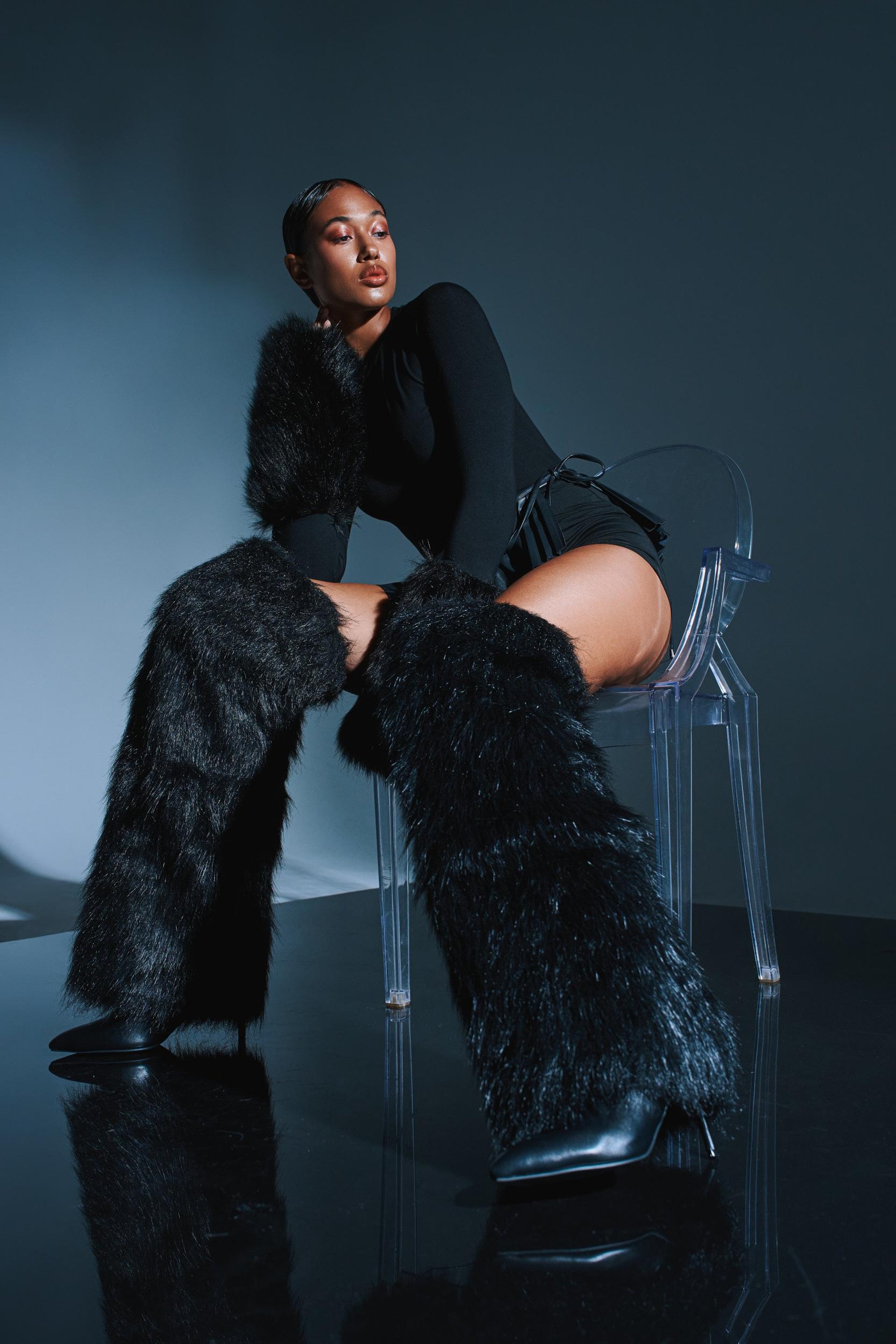 Be so furreal, you need The AZALEA WANG Langleye Black Thigh-High Fur Luxe Boot in your shoedrobe. These thigh-high stunners are crafted from sleek faux leather and feature a pointed-toe silhouette, a slim stiletto heel, and a tonal, ultra-plush faux fur shaft overlay that adds fabulous flair. Complete with an inner-ankle zipper closure. - Faux Leather and Faux Fur Upper- Pointed Toe- Stiletto Heel- Thigh-High Shaft- No Stretch- Imported (all measurements approximate from size 7.5)- 3.75” Heel Height- 28” Shaft Height- 23” Shaft Opening CircumferenceProduct ID: 1055010