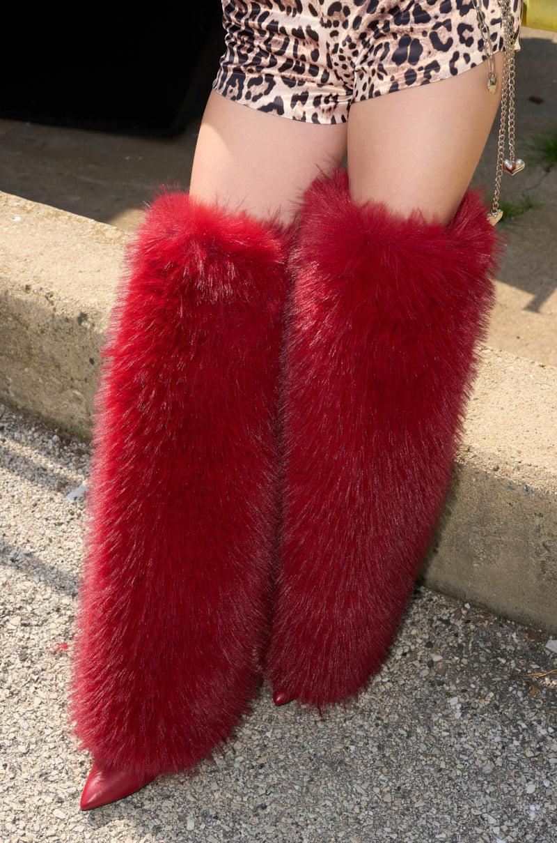 Be so furreal, you need The AZALEA WANG Langleye Red Thigh-High Fur Luxe Boot in your shoedrobe. These thigh-high stunners are crafted from sleek faux leather and feature a pointed-toe silhouette, a slim stiletto heel, and a tonal, ultra-plush faux fur shaft overlay that adds fabulous flair. Complete with an inner-ankle zipper closure. - Faux Leather and Faux Fur Upper- Pointed Toe- Stiletto Heel- Thigh-High Shaft- No Stretch- Imported (all measurements approximate from size 7.5)- 3.75” Heel Height- 28” Shaft Height- 23” Shaft Opening CircumferenceProduct ID: 1055190