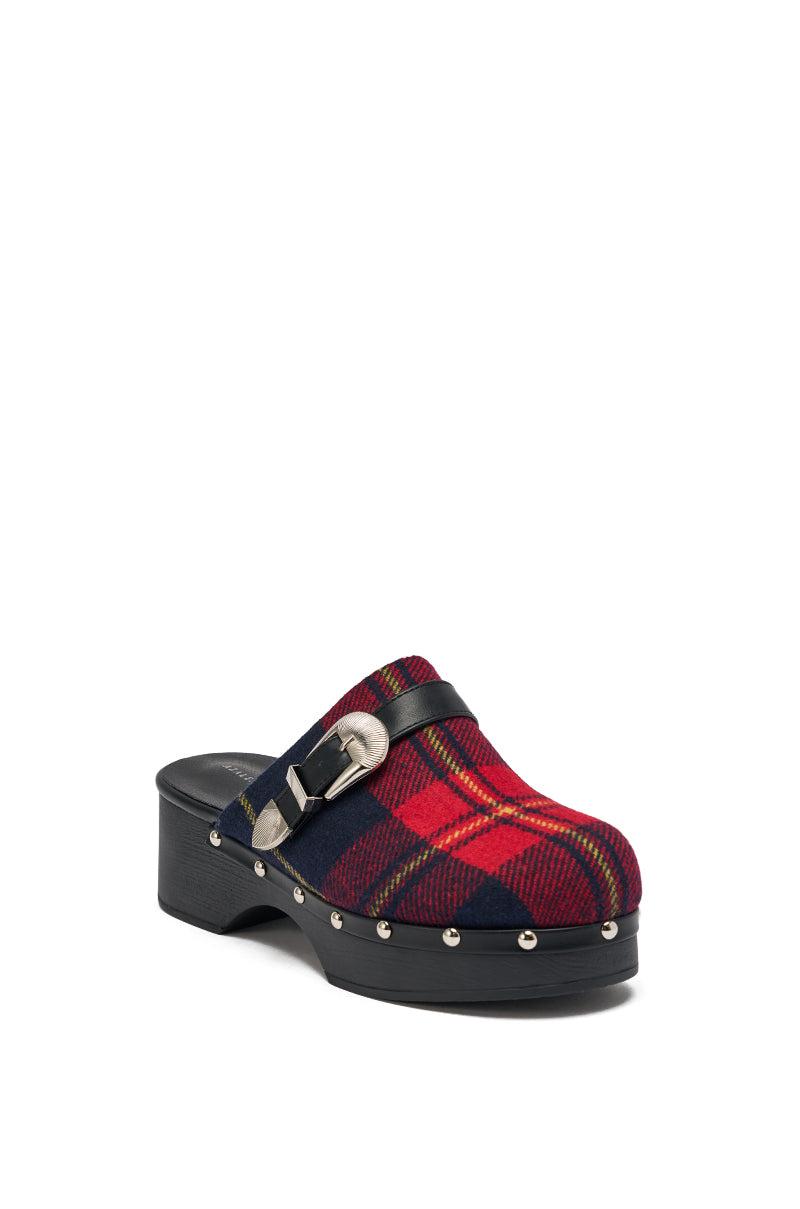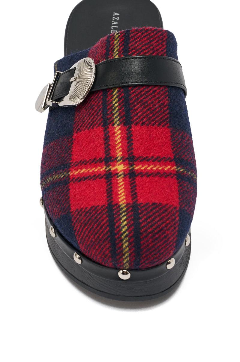 Cozy meets cool with the AZALEA WANG Latifah Red Plaid Chunky Heel Mule. These cuties are crafted from a wool-like, plaid fabric and features an almond toe, an arched outsole with a chunky heel, silver stud trim detailing, an adjustable silver buckle accent wrapping around the top of the shaft, and a cushioned insole. Complete with a slip-on fit. Effortlessly chic, pair with jeans, midi skirts, or oversized knits. - Textile Upper- Almond Toe- Chunky Heel- Imported (all measurements approximate from size 8)- 1.25” Sole Height- 2.25” Heel HeightProduct ID: 1074090