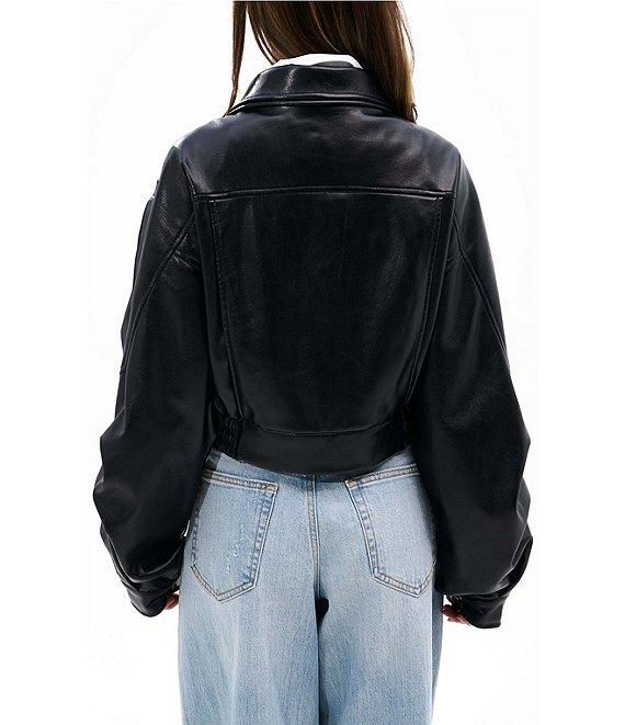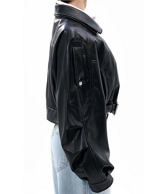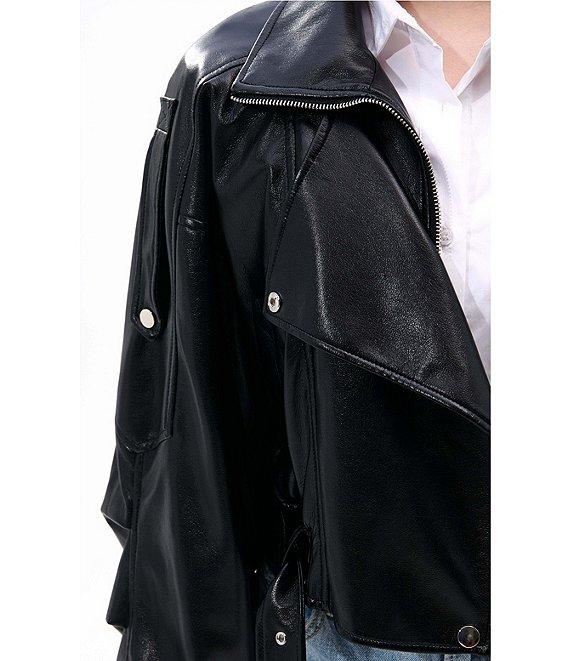 From Azalea Wang, this jacket features: Soft faux leather fabrication Moto silhouette Envelope collar neckline Long sleeves Front pockets Belted Mid weight Oversize fit Fully lined Straight hemline Zip front closure Approx. 29" length Polyester; lining: polyester Dry clean Imported.
