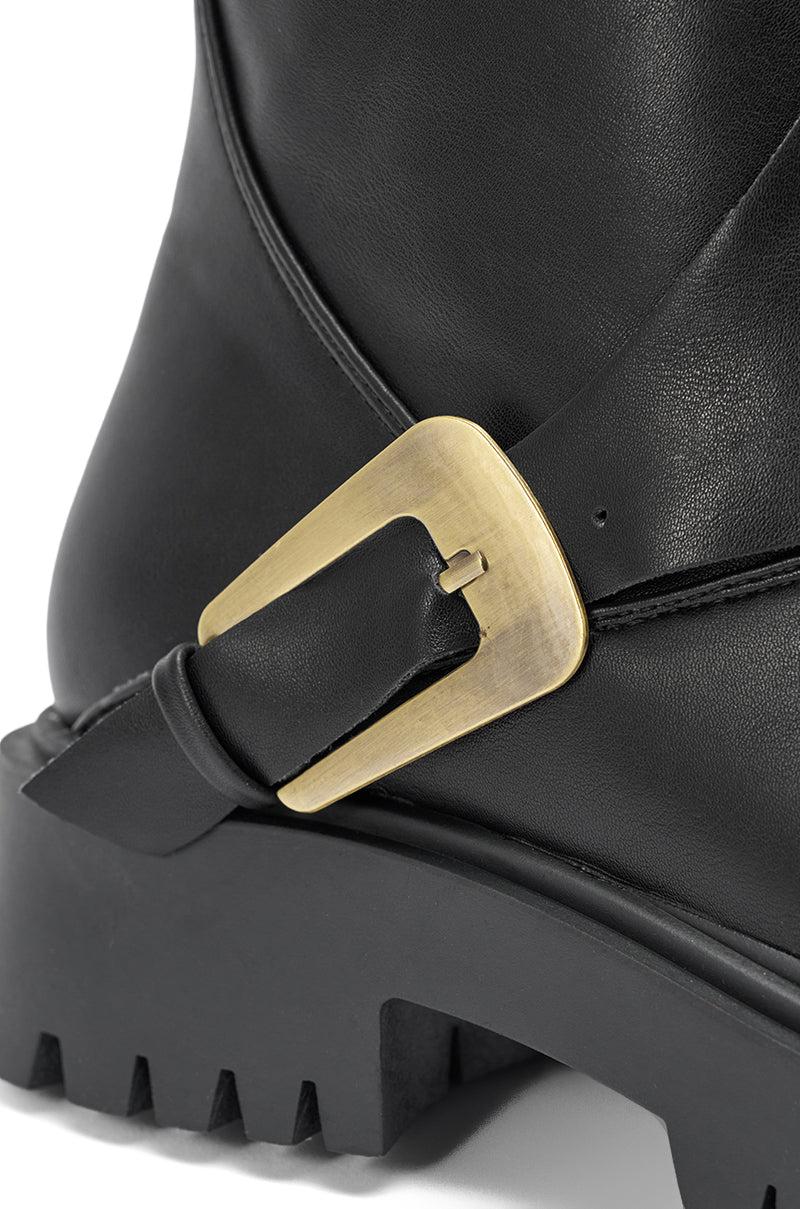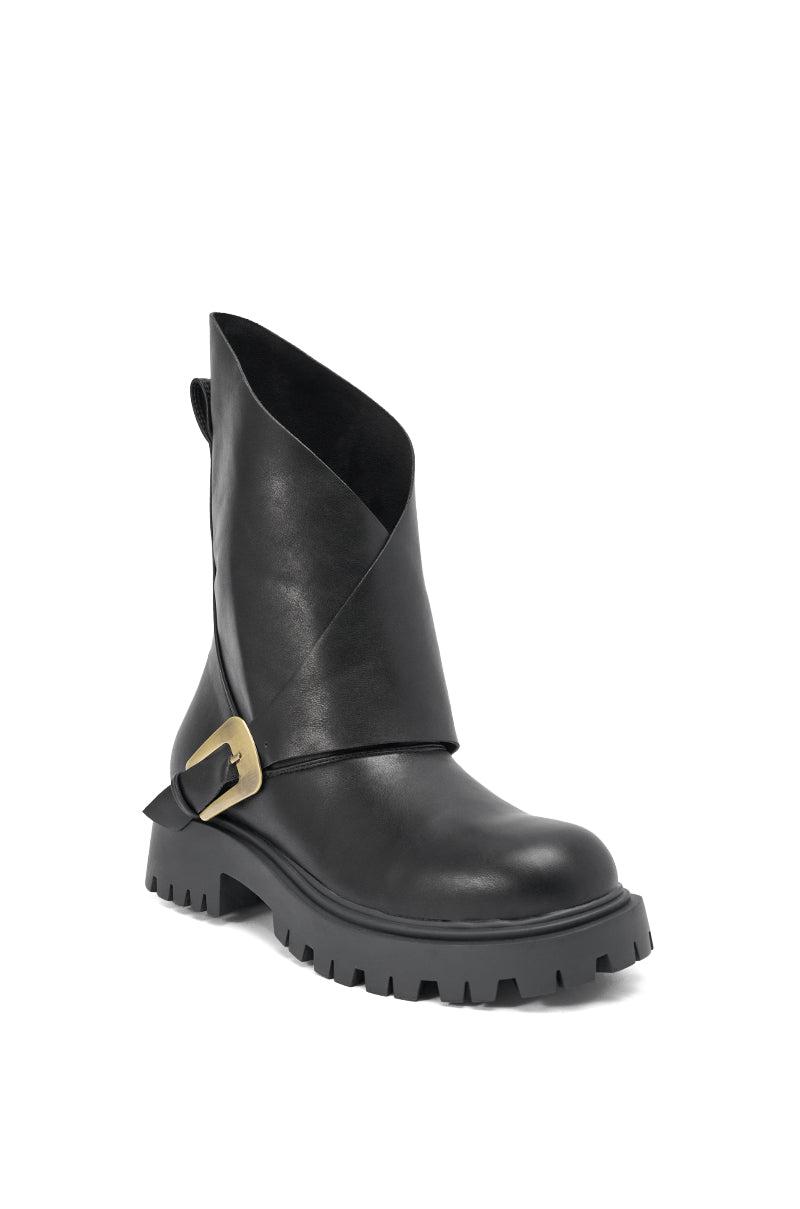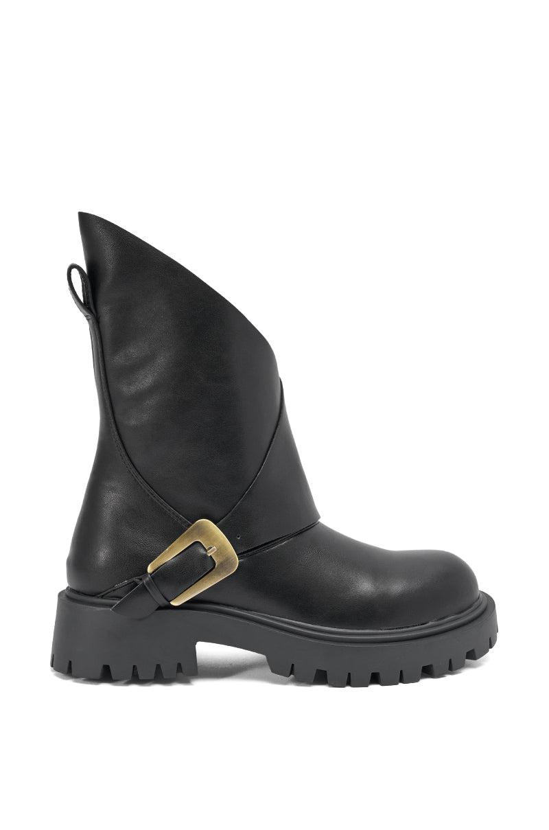 Biker baddies to the front! The AZALEA WANG Phrixus Black Chunky Short Shaft PU Boot is designed for bold, modern style, featuring a soft faux leather finish, an asymmetrical fold-over shaft, and a statement brushed-gold buckle detail. Its silhouette boasts a chunky lug sole, round toe, and mid calf rise. Pair with a tight black pant and oversized band tee for a comfy rocker look. - Faux Leather Upper- Round Toe - Chunky Heel- Platform Lug Sole- Mid-Calf Shaft- No Stretch- Imported (all measurements are approximate from size 7.5)- 2” Heel- 1.5” Sole Height- 9” Shaft Height (highest point)- 11.5” Shaft Opening CircumferenceProduct ID: 1081457