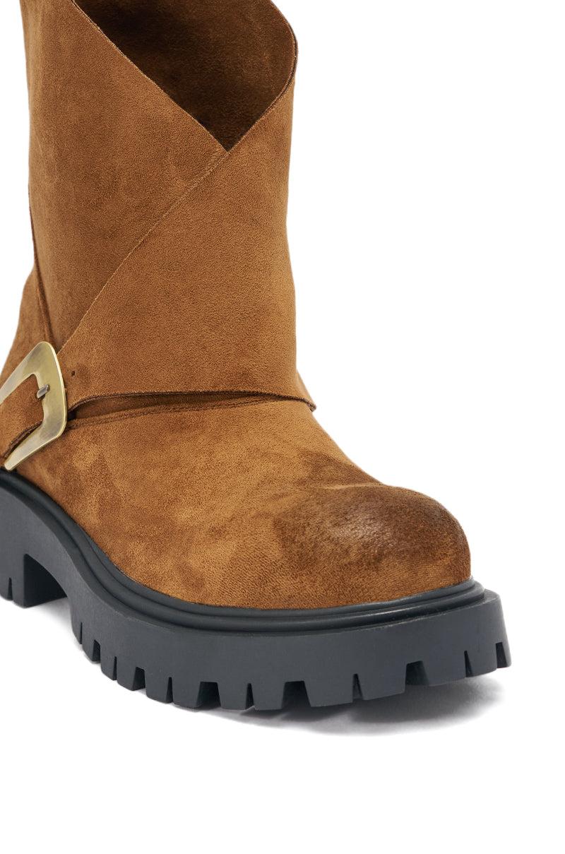 Ready to rock! The AZALEA WANG Phrixus Brown Chunky Short Shaft PU Boot features a chunky lug sole, round platform lug sole, and a mid calf asymmetrical fold-over shaft with a brushed-gold buckle. With a buttery, brown faux suede upper, this boot pairs perfectly with a slim jean and sweater for a cozy, cute look. - Faux Suede Upper- Round Toe - Chunky Heel- Platform Lug Sole- Mid-Calf Shaft- No Stretch- Imported (all measurements are approximate from size 7.5)- 2” Heel- 1.5” Sole Height- 9” Shaft Height (highest point)- 11.5” Shaft Opening CircumferenceProduct ID: 1081466