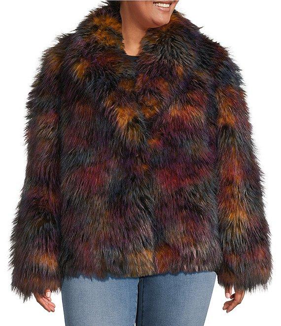 From Azalea Wang Plus, this jacket features: Faux fur fabrication Single breasted silhouette Abstract print Oversize shawl collar neckline Long sleeves Two front pockets Oversize fit Fully lined Straight hemline Hook and eye closure Approx. 34" length Polyester Dry clean Imported.