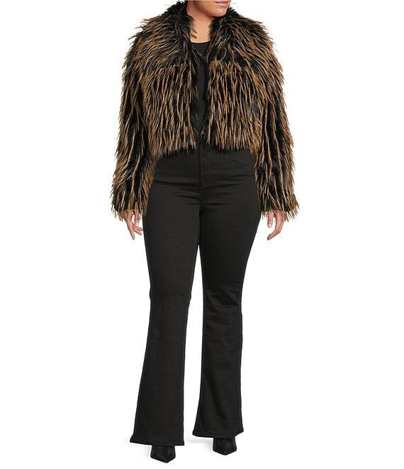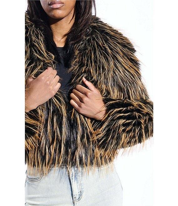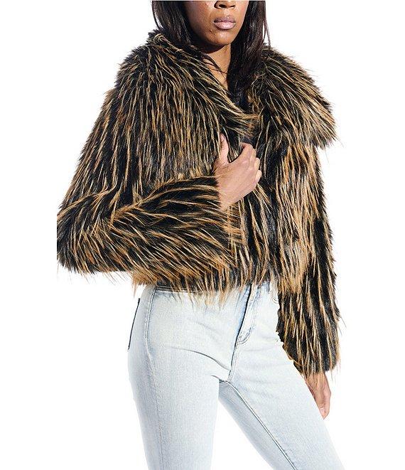 From Azalea Wang, this jacket features: Faux fur fabrication Bolero silhouette Oversize collared neckline Long sleeves No pockets Oversize cropped fit Fully lined Straight hemline Hook front closure Approx. 20" length Polyester Dry clean Imported.