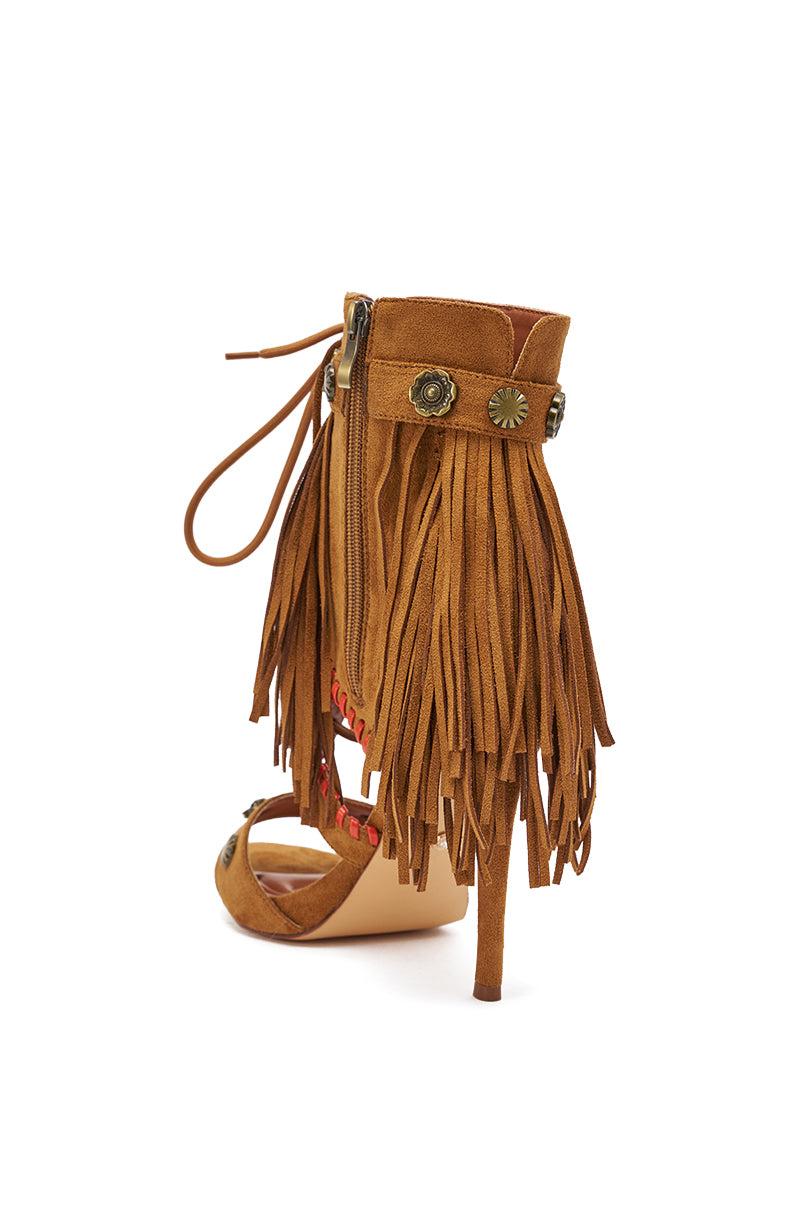 The AZALEA WANG Salgado Fringe Gladiator Stiletto Sandal is a boho-inspired heeled sandal that is crafted from a rich tan faux suede with intricate Western-meets-festival detailing. It features an open almond toe, a slim stiletto heel, and an ankle-high silhouette with a lace-up vamp and adorned with cascading fringe, contrast hand-woven accents, and antique brass hardware embellishments. It also boasts a coordinating, embellished toe strap. Complete with a Comfort Cushion insole, and an inner ankle zip closure. Pair with micro shorts and a flowy blouse, perfect for festivals or standout going-out looks. - Faux Suede Upper- Open Almond Toe- Stiletto Heel- Ankle-High Shaft- Imported (all measurements approximate from size 10)- 4.5” Heel Height- 5.75” Shaft Height- 11” Shaft Opening CircumferenceProduct ID: 1086008