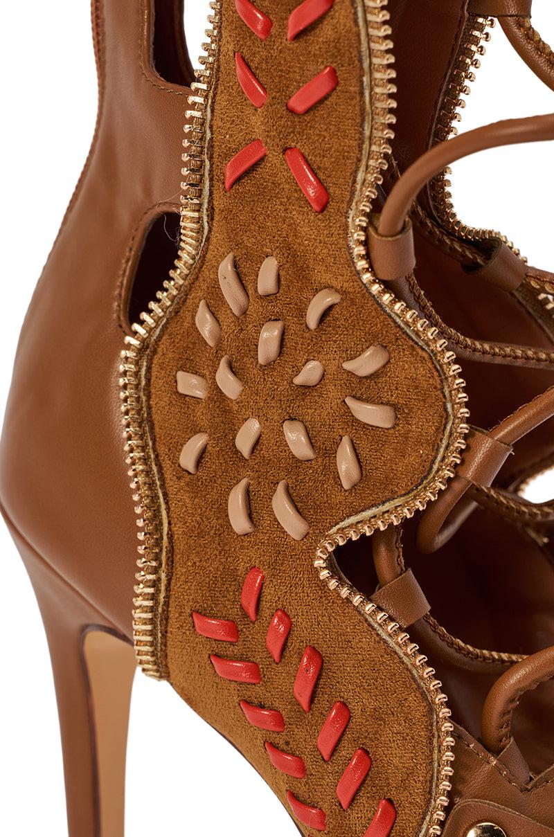 Striking knee-high tan gladiator heel with embroidery designed to elevate statement styling with bold, artisanal detail. Crafted in a rich tan tone, this standout sandal features intricate cutout gladiator panels, lace-up detailing in the front, and contrast stitching accents over suede panels that create visual depth and texture. The open-toe silhouette, slim high heel, and knee-high shaft offer a sleek, leg-lengthening effect, finished with a back zipper, Comfort Cushion insole, and zipper detailing along the panels. This show-stopping style pairs perfectly with mini dresses, skirts, or denim for nights out, special events, or elevated street-style looks. - Faux Leather Upper- Almond Open Toe- Stiletto Heel- Knee-High Shaft- No Stretch- Imported (all measurements are approximate from size 10)- 4.5” Heel- 16” Shaft Height (highest point)- 11” Shaft Opening Circumference (adjustable)- 10” Calf Opening Circumference (adjustable)Product ID: 1093732