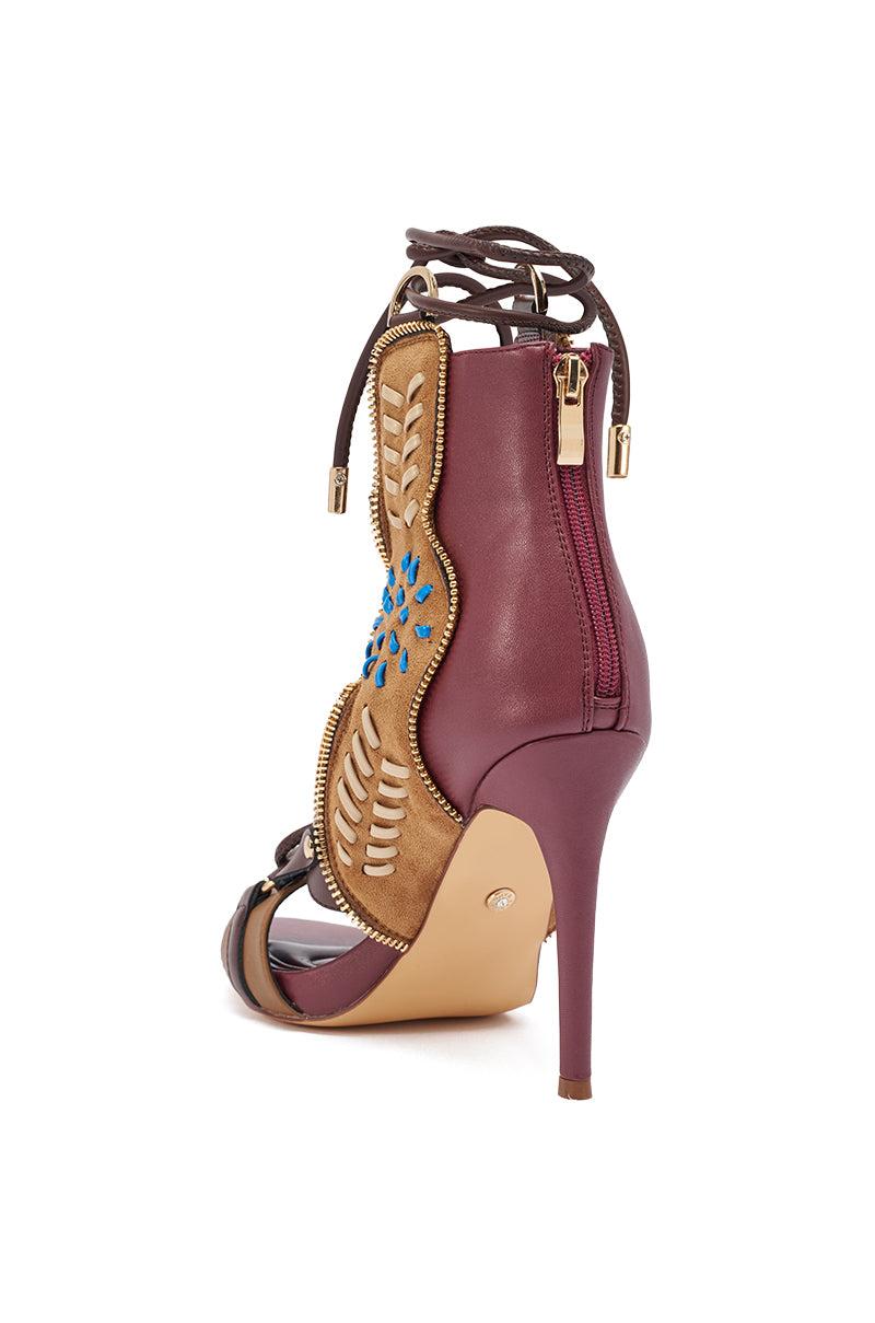 Plum Perfect! The AZALEA WANG Shainia Plum Multi Suede Stiletto Sandal delivers western flare with its bold, embroidered statement panels in brown suede, accented by vibrant tan and blue details, striking faux leather plum-colored upper, and gold hardware zippers. Featuring wraparound brown laces, a Comfort Cushion insole, brown buckle strap and pull tabs with gold hardware, a back zipper enclosure, and a sleek open almond toe design, these heels blend boho craftsmanship with high-fashion edge. Style with a simple mini dress to let these sandals shine! - Suede and Faux Leather Upper- Open Almond Toe - Stiletto Heel- Ankle-High Shaft- No Stretch- Imported (all measurements are approximate from size 10)- 4.5” Heel- 5” Shaft Height - 9.5” Shaft Opening Circumference (adjustable)Product ID: 1091086