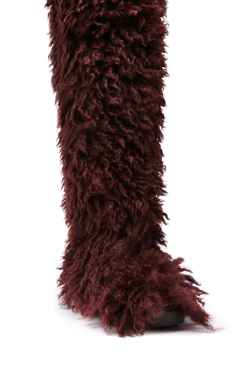 Fur-get the cold when you’re wearing the AZALEA WANG Templeton Burgundy Poodle Fur Over The Knee Boot. Crafted from a shaggy, plush faux poodle-like fur, these bold boots boast an over-the-knee shaft, an almond toe, a tonal flat sole with a treaded bottom, and an effortless, pull-on fit. Pair with a mini skirt, leggings, and a sherpa bomber for a winter baddie finish. - Faux Fur Upper- Almond Toe- Flat Sole- Over-The-Knee Shaft- No Stretch- Imported (all measurements approximate from size 7.5)- 24” Shaft Height- 22” Shaft Opening Circumference- 16” Calf CircumferenceProduct ID: 1056080