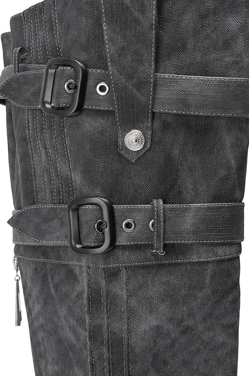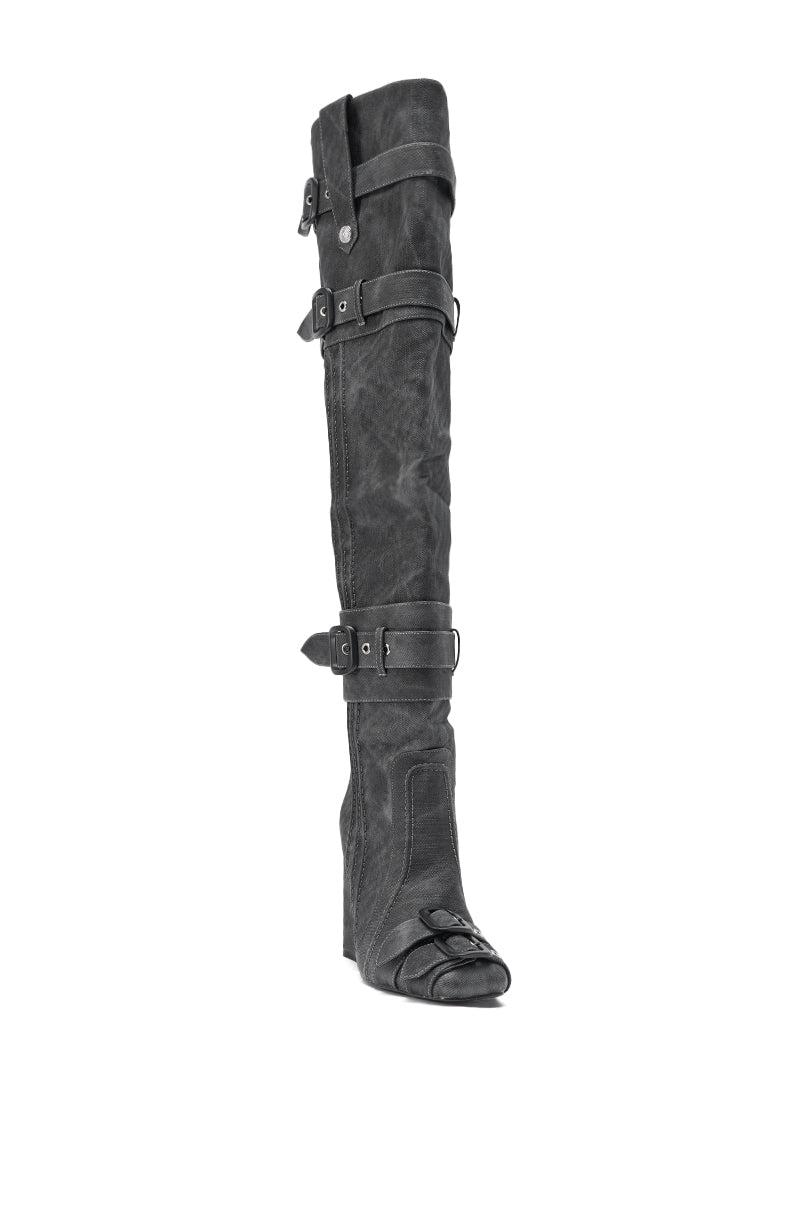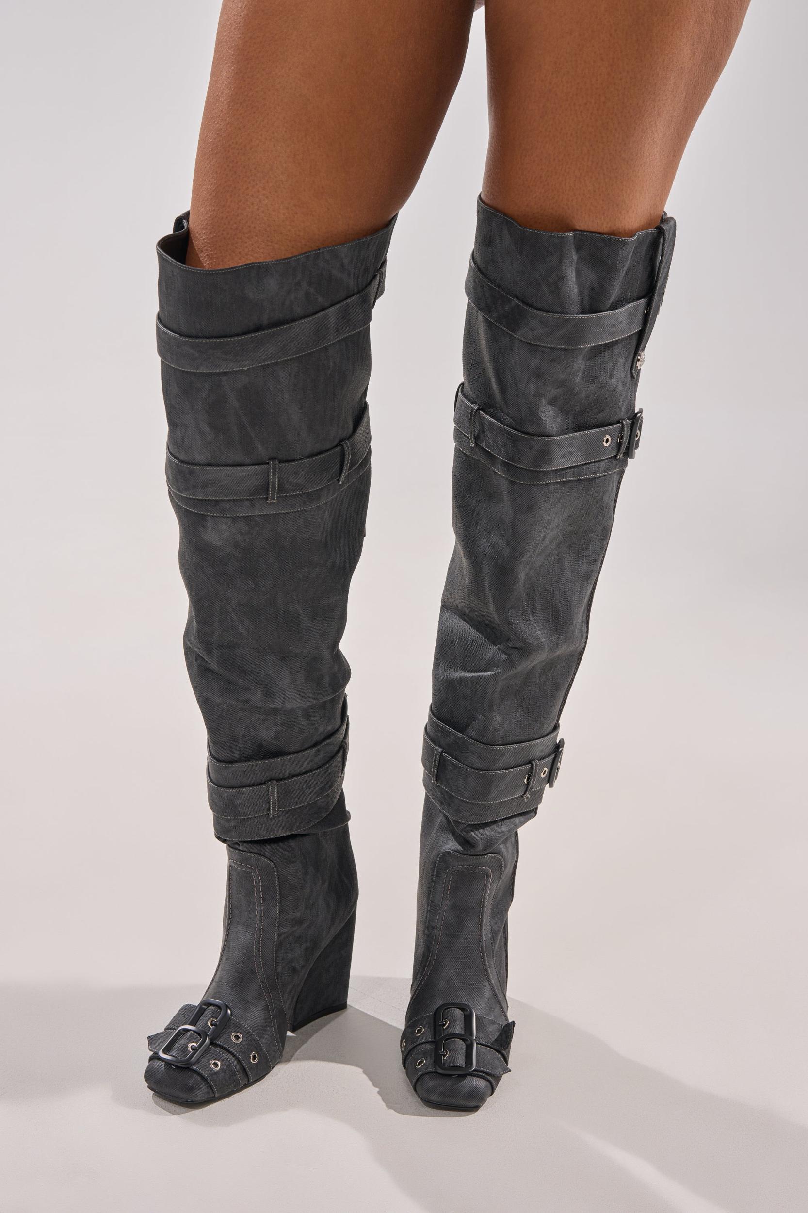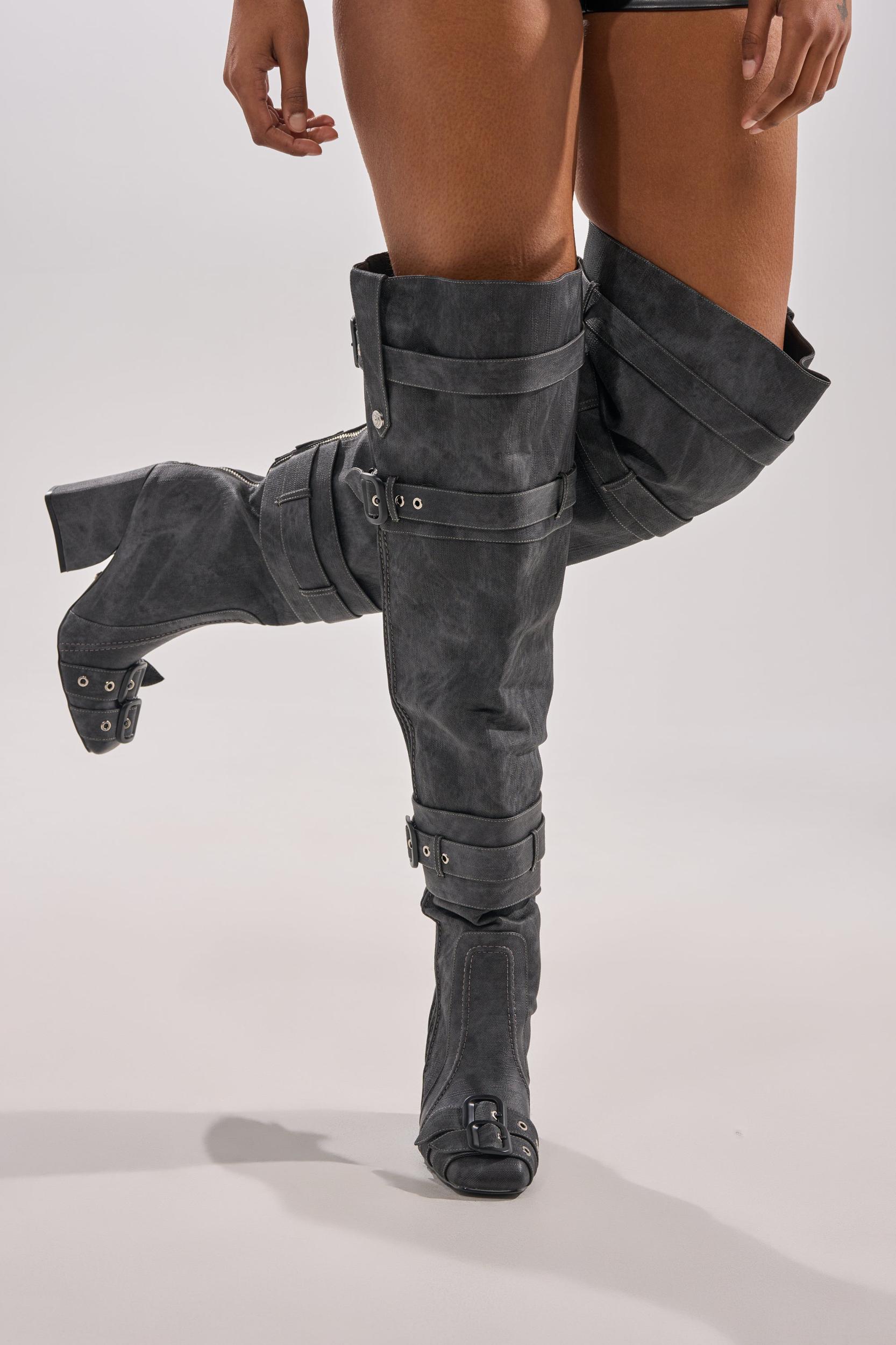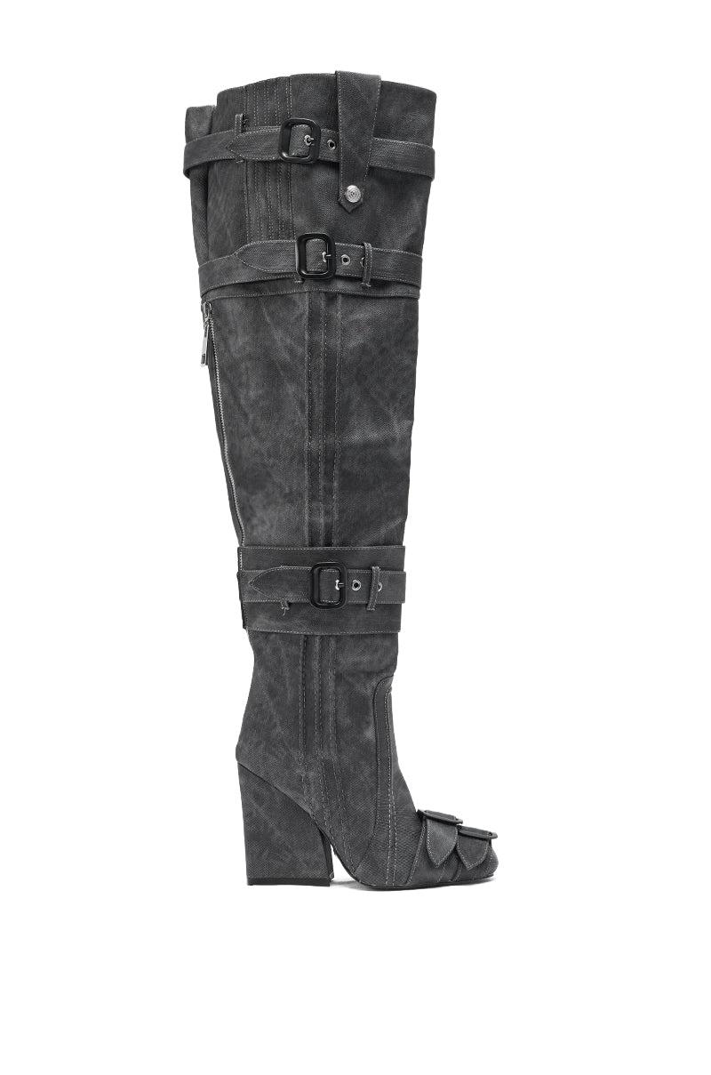 Boot scootin’ boogie the night away with the AZALEA WANG Trillion Charcoal Chunky Thigh High Boot! These edgy thigh-high boots feature a rugged distressed finish and multiple adjustable buckle straps that deliver a bold, utilitarian-inspired look. Crafted with a sturdy block heel, square toe, back zipper enclosure, and structured silhouette, they offer both comfort and standout style, perfect for elevating streetwear, festival outfits, or everyday looks with a tough-chic edge. Style with a mini skirt and sheer blouse for an edgy going out outfit! - Textile Upper- Square Toe - Block Heel- Thigh-High Shaft- No Stretch- Imported (all measurements are approximate from size 7.5)- 4” Heel- 23.5” Shaft Height - 21.5” Shaft Opening Circumference- 15” Calf Circumference Product ID: 1081206