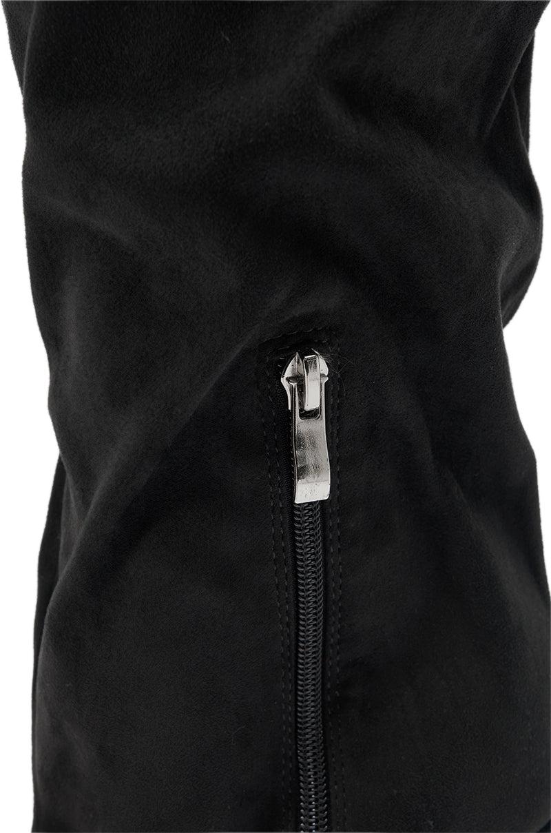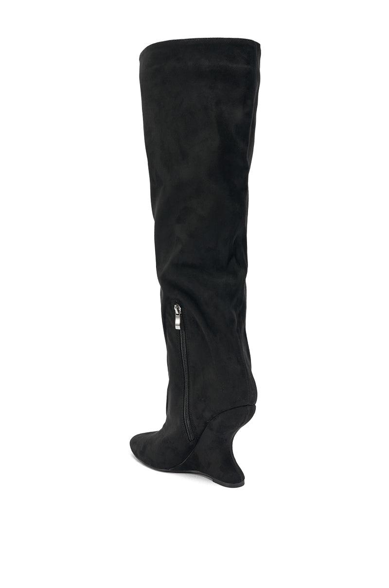 These boots were made for stomping! The AZALEA WANG Vince Black Faux Suede Wedge Boot features a unique inverted wedge heel, knee high shaft, sleek pointed toe, and smooth suede material. Pair with a mini skirt and sparkly top for the perfect girls night out outfit. - Faux Suede Upper- Pointed Toe - Inverted Wedge Heel- Knee High Shaft- No Stretch- Imported (all measurements are approximate from size 10)- 4.5” Heel- 20” Shaft Height- 16” Calf Circumference- 19” Calf Opening CircumferenceProduct ID: 1087871