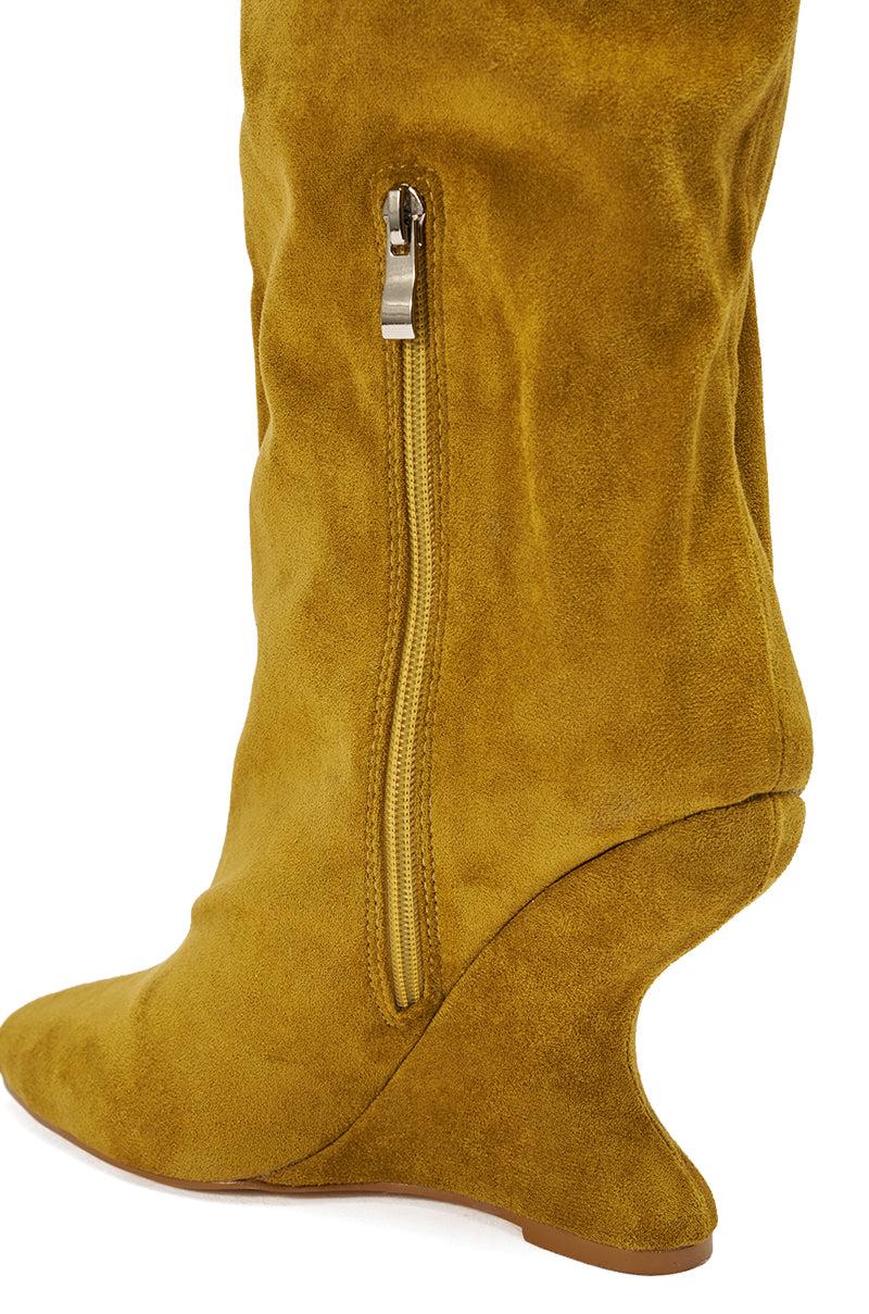 The AZALEA WANG Vince Mustard Faux Suede Wedge Boot is an autumnal essential. Crafted from buttery faux suede, this knee-high stunner features a pointed toe, an inverted wedge heel, a slouchy shaft, an inner ankle zip closure, and a padded insole. Pair with pleated skirts or corduroy trousers for a cozy, elevated finish. - Faux Suede Upper- Pointed Toe- Inverted Wedge Heel- Knee-High Shaft- Imported (all measurements approximate from size 10)- 4.5” Heel Height- 18” Shaft Height- 20” Shaft Opening Circumference- 12” Calf CircumferenceProduct ID: 1087881