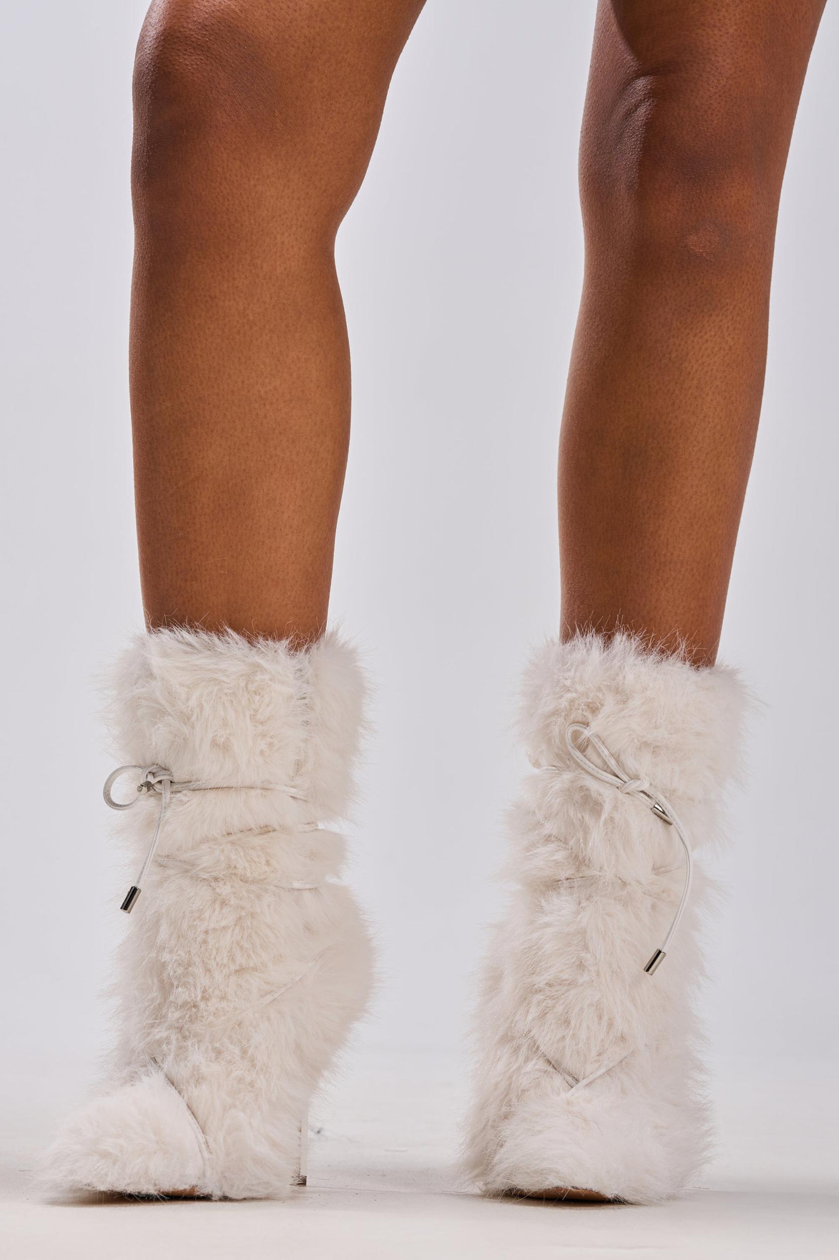 No chill, just fur. The AZALEA WANG Vitya Ivory Fur Bootie is crafted from luscious faux fur and features a pointed toe silhouette, a tonal faux leather stiletto heel, a mid-calf shaft, coordinating faux leather self-tie straps that wrap around the body of the shoe, and an inner ankle zip closure. Complete with a pull-on fit. Pair with flared pants, a sherpa jacket, and cozy earmuffs for a snow bunny-inspired finish. - Faux Fur Upper- Pointed Toe- Stiletto Heel- Mid-Calf Shaft- Imported (all measurements approximate from size 7.5)- 4.5” Heel Height- 7” Shaft Height- 12” Shaft Opening CircumferenceProduct ID: 1056145