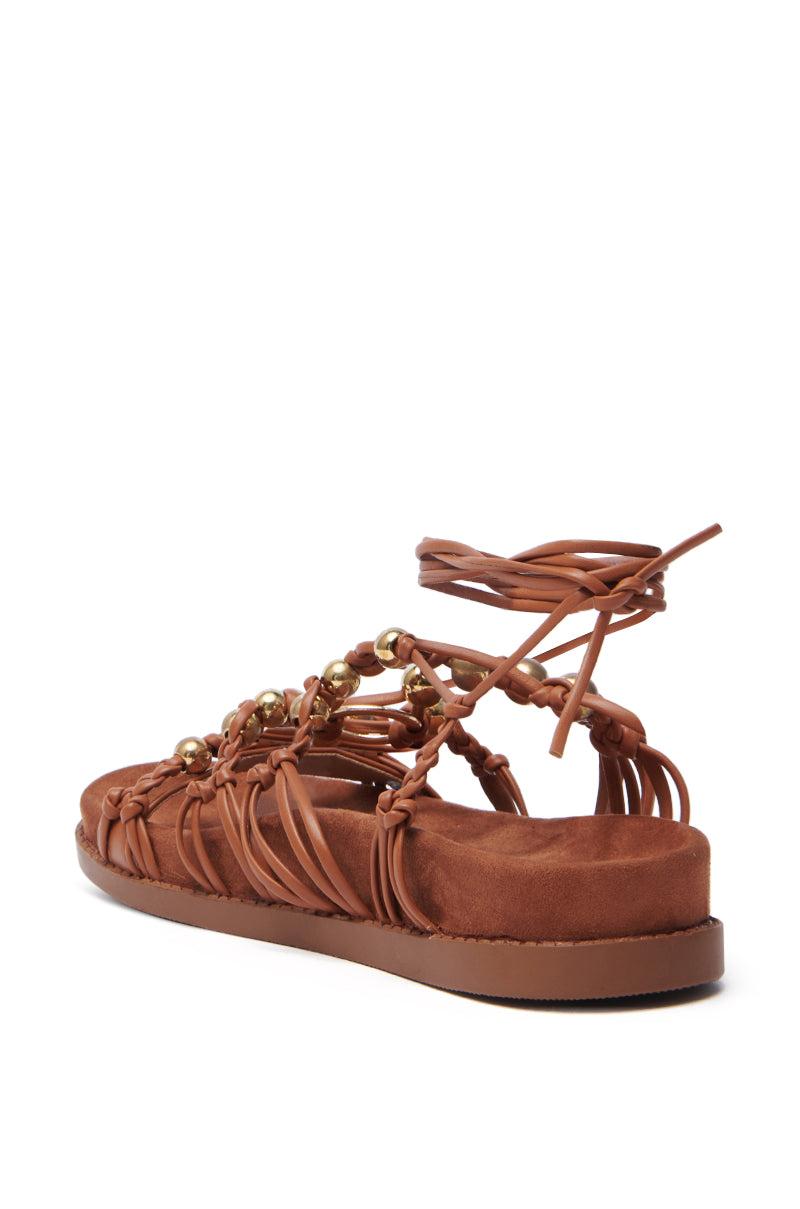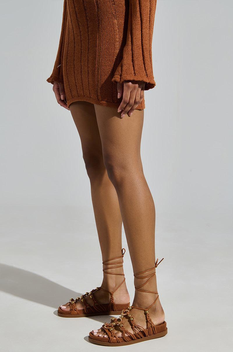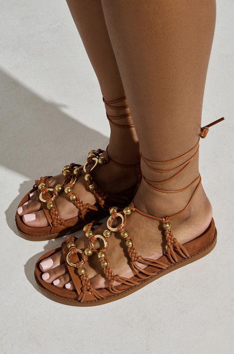 The AZALEA WANG Xyla Brown Faux Suede Sandal is a warm weather staple. This simple-yet-chic sandal features a soft faux suede insole, a flat rubber outsole, a strappy vamp crafted from braided, tonal faux leather, metallic gold beads, and coordinating gold O-rings, self-tie straps that wrap around the ankle, and a sculpted footbed designed to cushion and accommodate the arch and curvature of a foot. The perfect shoe for a trip to the beach or a day spent at a music fest. - Faux Leather Upper- Faux Suede Insole- Open Almond Toe- Flat Sole- Imported Product ID: 1024657