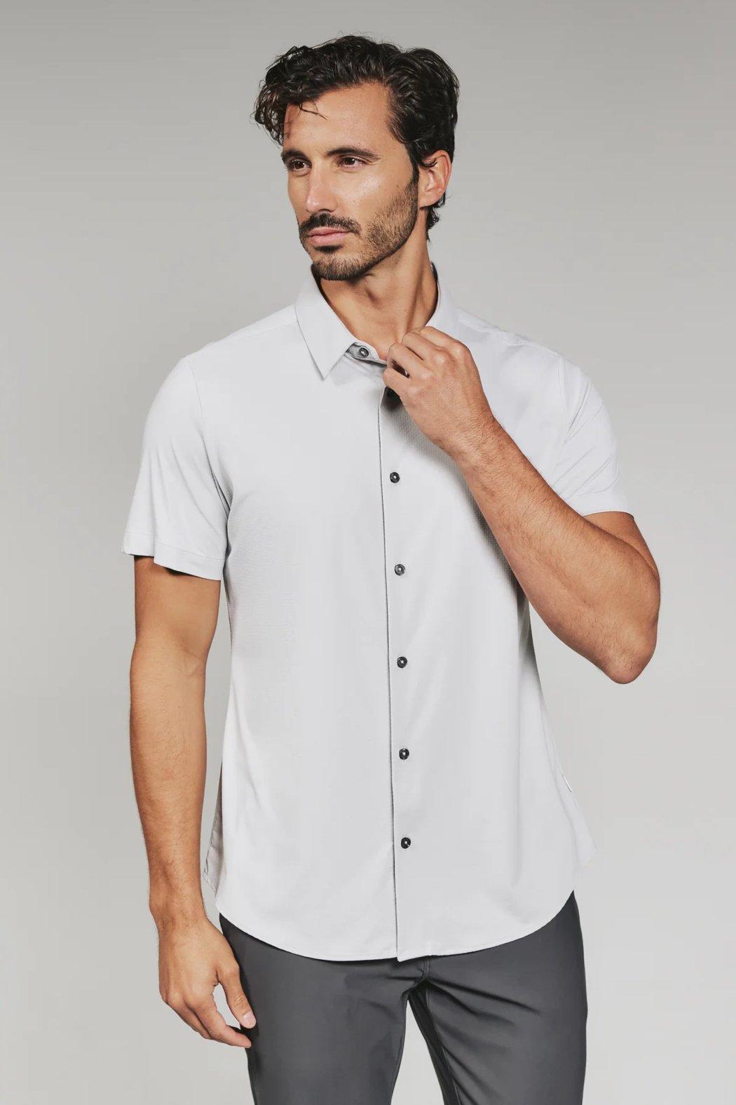 We created the perfect short sleeve button up, with the right mixture of comfort and style, just for you. Crafted with a 4-way stretch structured knit that promises a light and airy feel like no other. DETAILS Model is 6'1" and wears a size medium. Care: Machine wash cold on delicate cycle with similar colors. Do not use products containing bleach, oil, or alcohol. Iron on low if needed. Hang to dry.