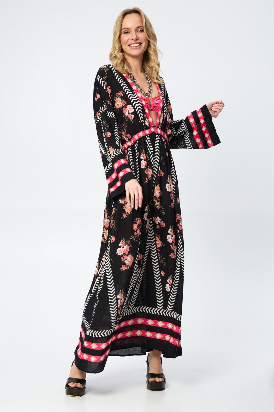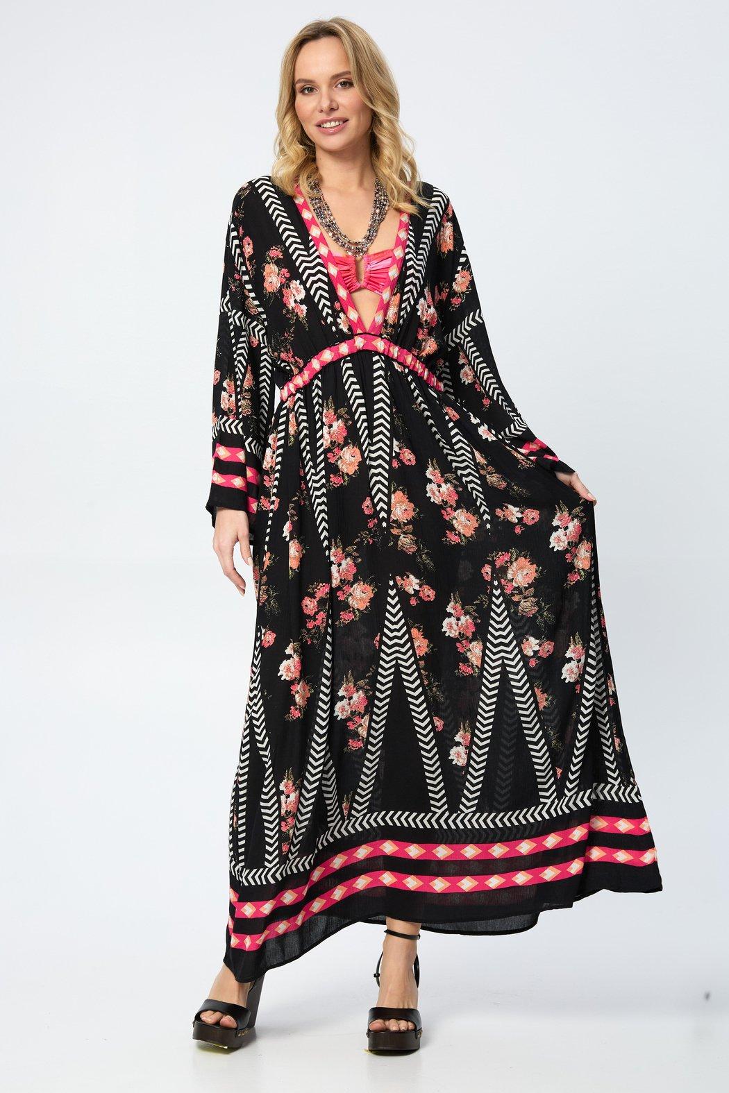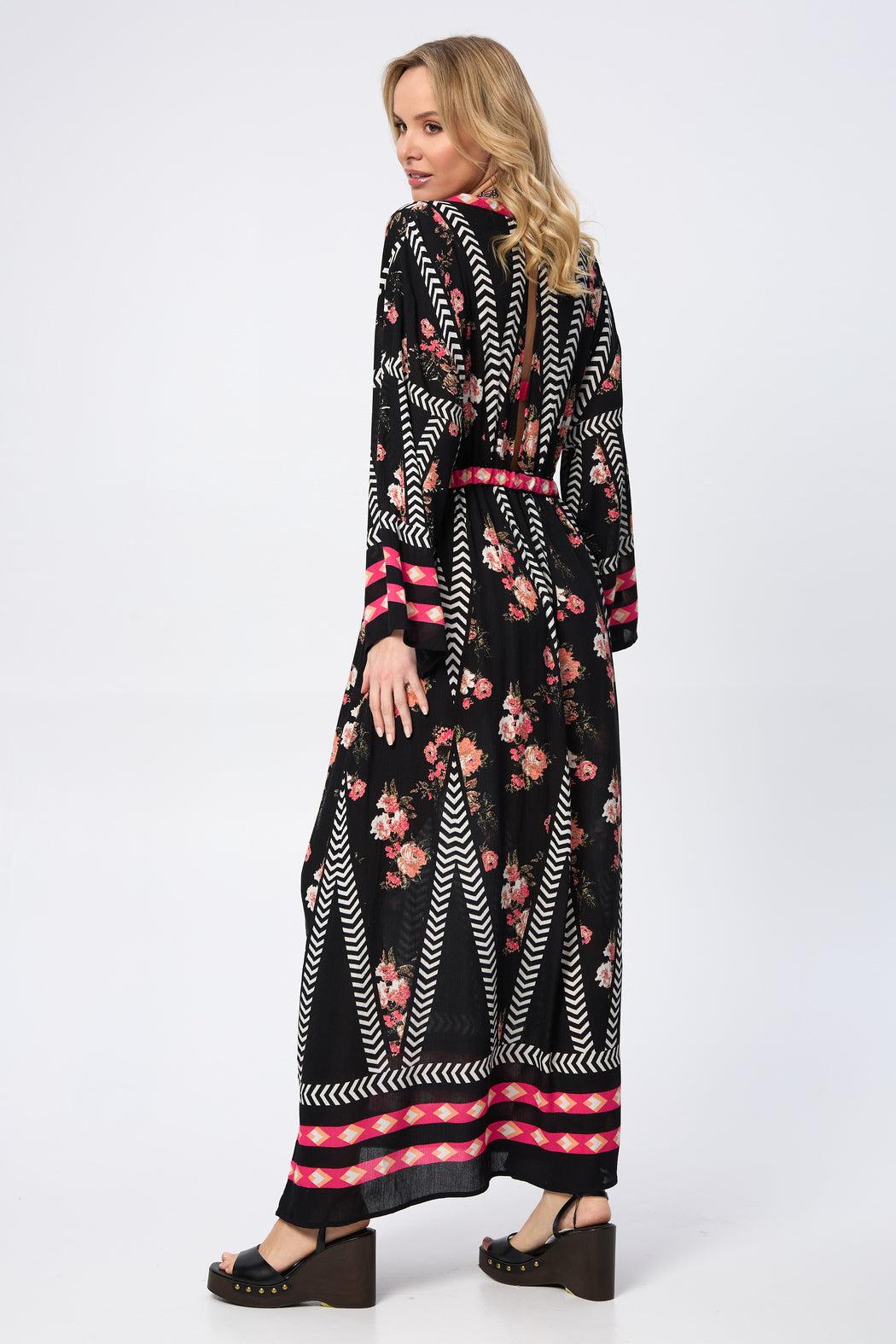 Our Aztec Floral Keyhole Kaftan boasts a stylish V-neck, adding a touch of elegance to your look. The back features a mesmerizing keyhole cutout, providing a subtle yet alluring detail that sets this kaftan apart. The standout feature is its stunning Aztec design, intricately integrating floral elements, creating a visually captivating and harmonious tapestry that's sure to turn heads. The breathable and lightweight fabric ensures all-day comfort; whether lounging at home, strolling on the beach, or attending a summer party, this kaftan is the perfect choice for style and ease.
