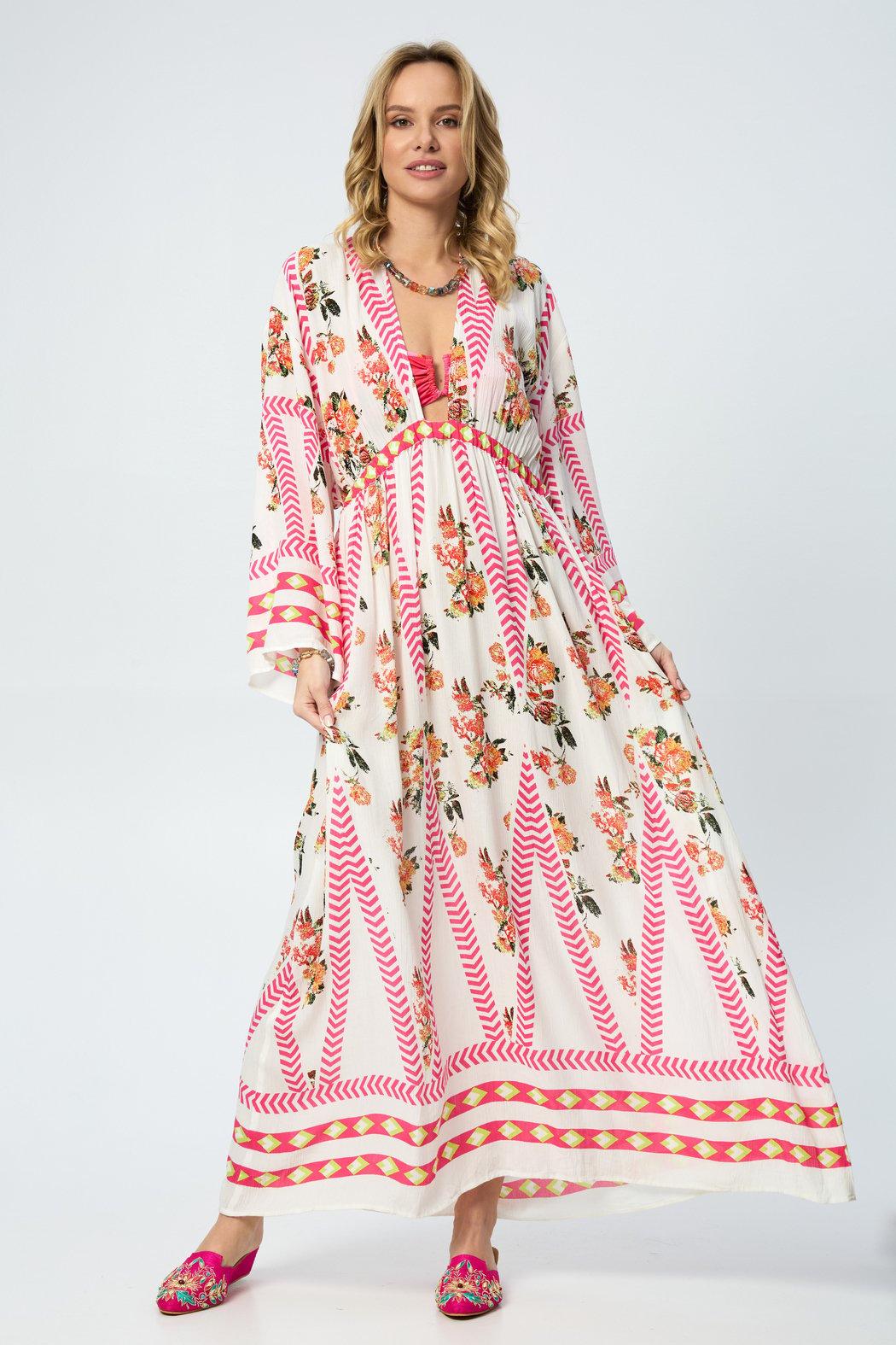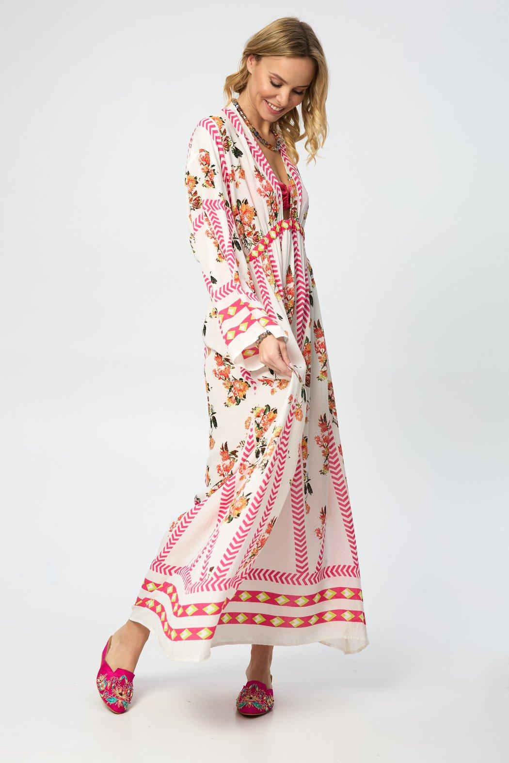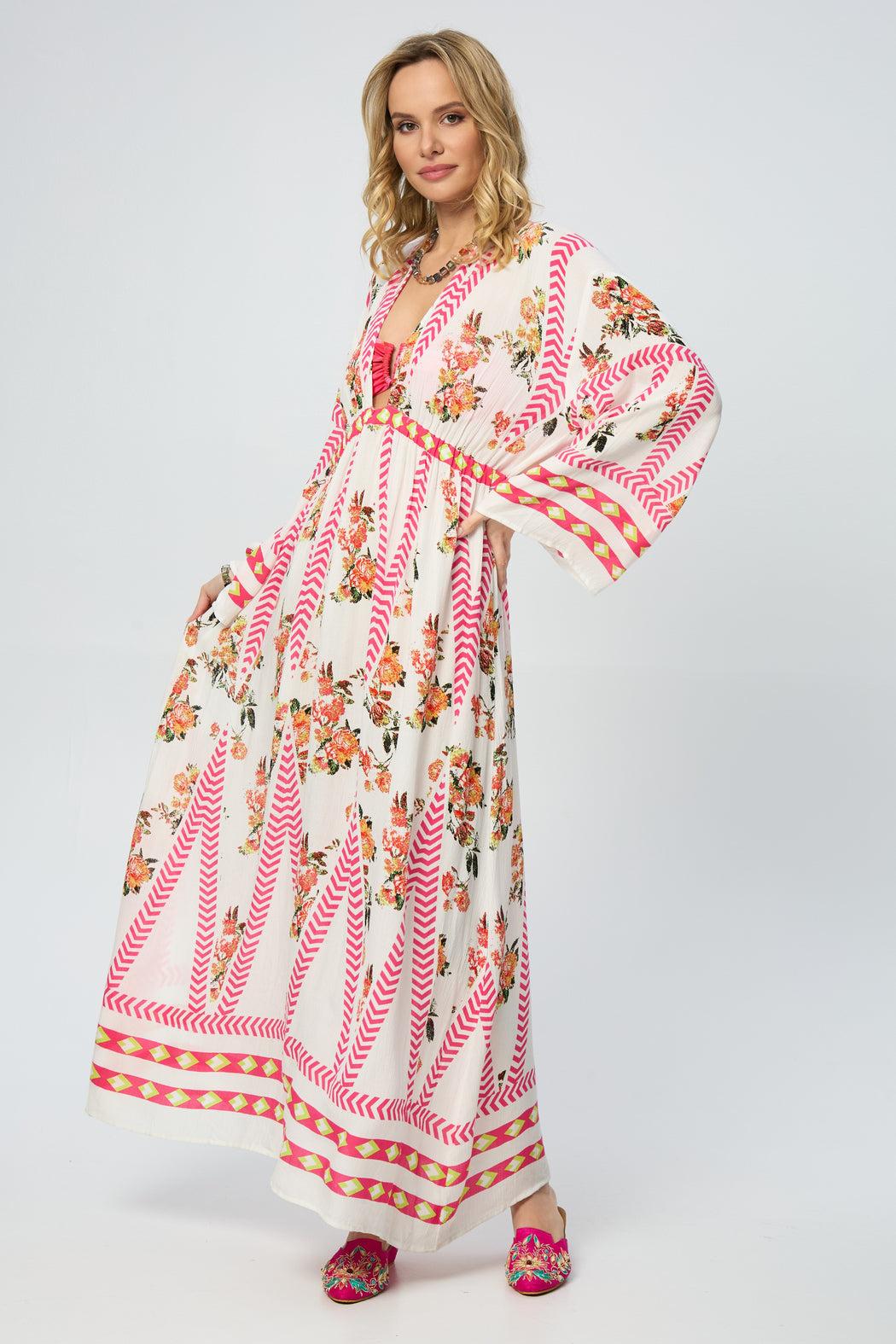 Our Aztec Floral Keyhole Kaftan boasts a stylish V-neck, adding a touch of elegance to your look. The back features a mesmerizing keyhole cutout, providing a subtle yet alluring detail that sets this kaftan apart. The standout feature is its stunning Aztec design, intricately integrating floral elements, creating a visually captivating and harmonious tapestry that's sure to turn heads. The breathable and lightweight fabric ensures all-day comfort; whether lounging at home, strolling on the beach, or attending a summer party, this kaftan is the perfect choice for style and ease.