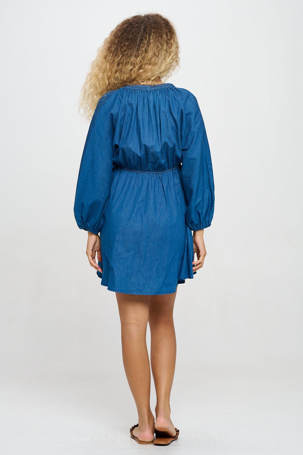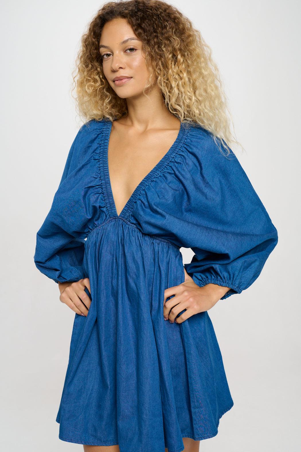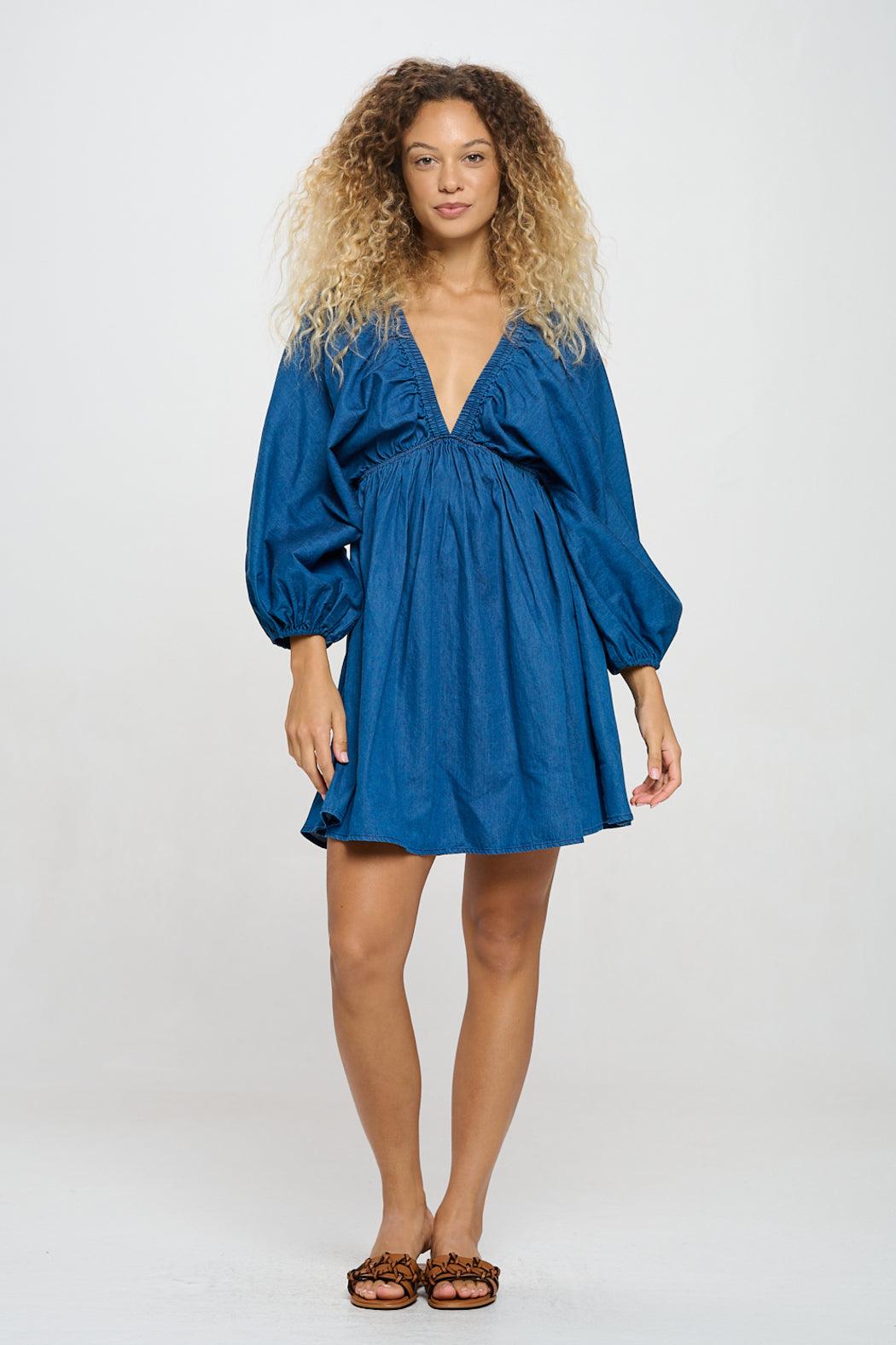 Step into style with this balloon sleeve denim mini dress, perfect for creating a bold yet effortlessly casual look. Featuring a deep V-neckline, voluminous sleeves, and a flowy silhouette, this dress is a timeless addition to your wardrobe with a touch of retro charm