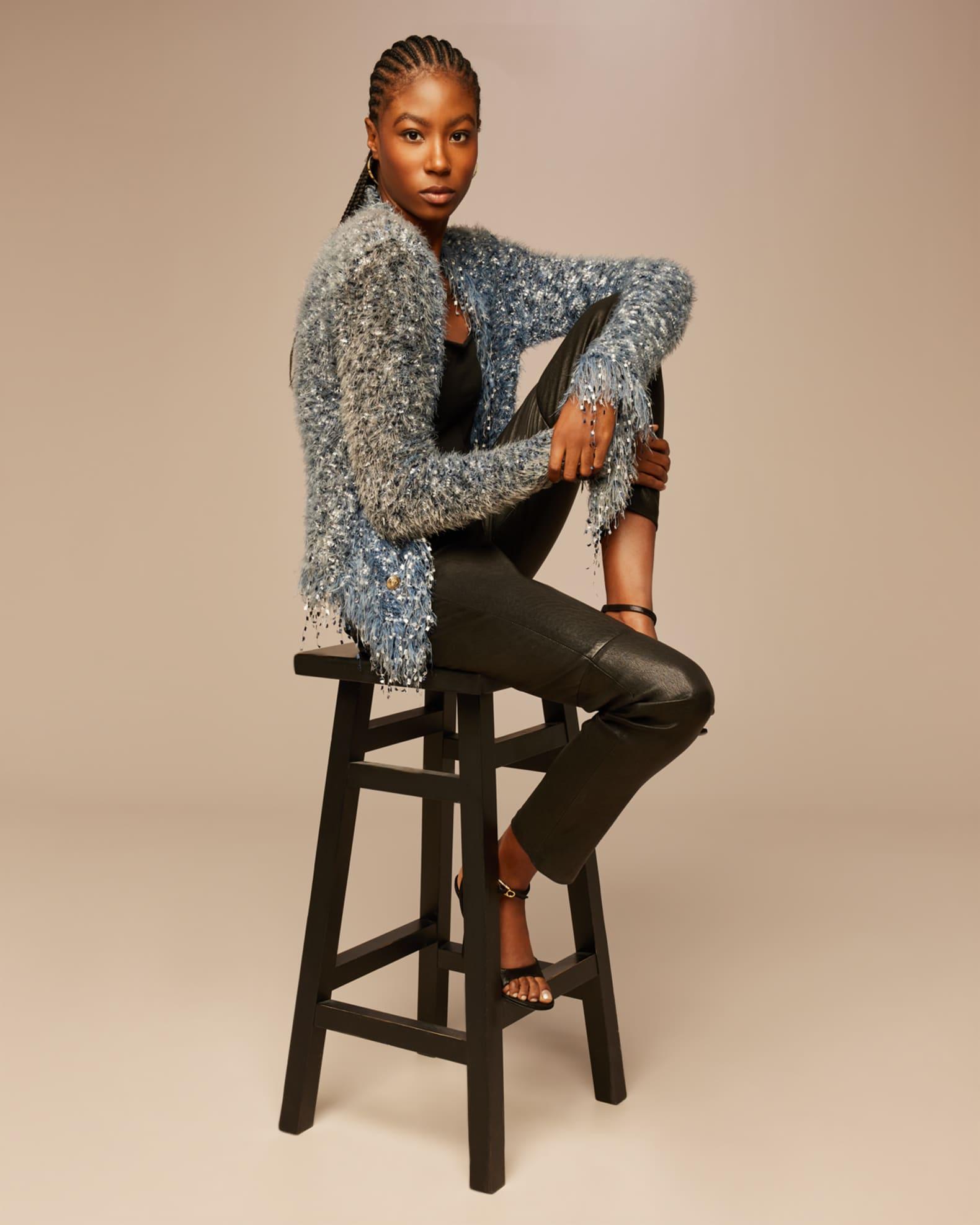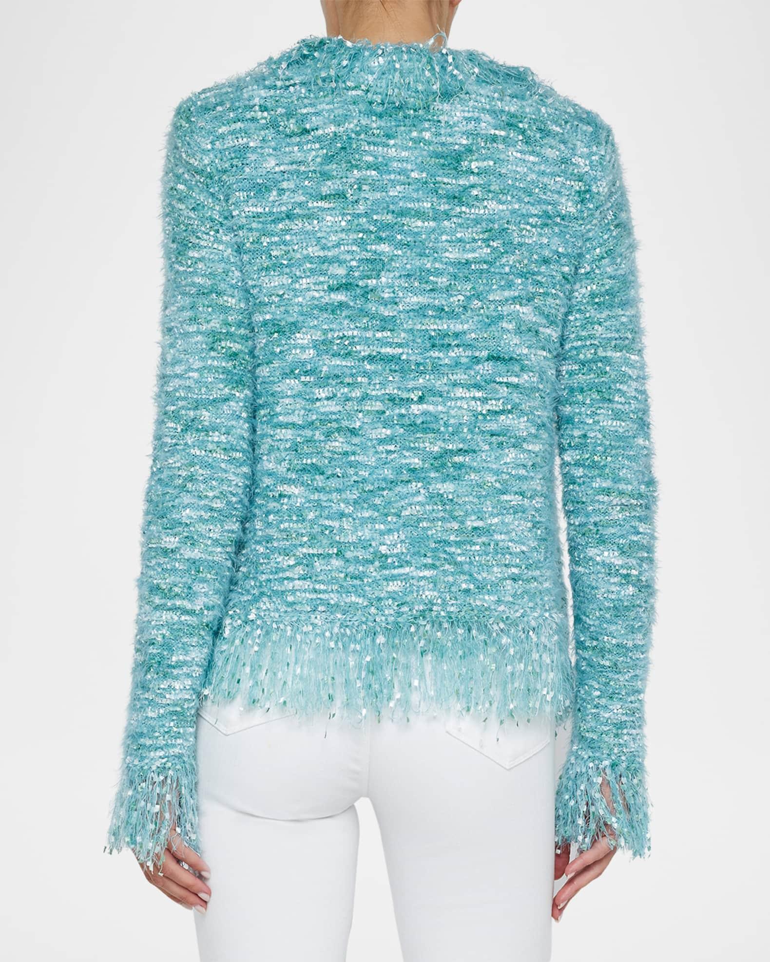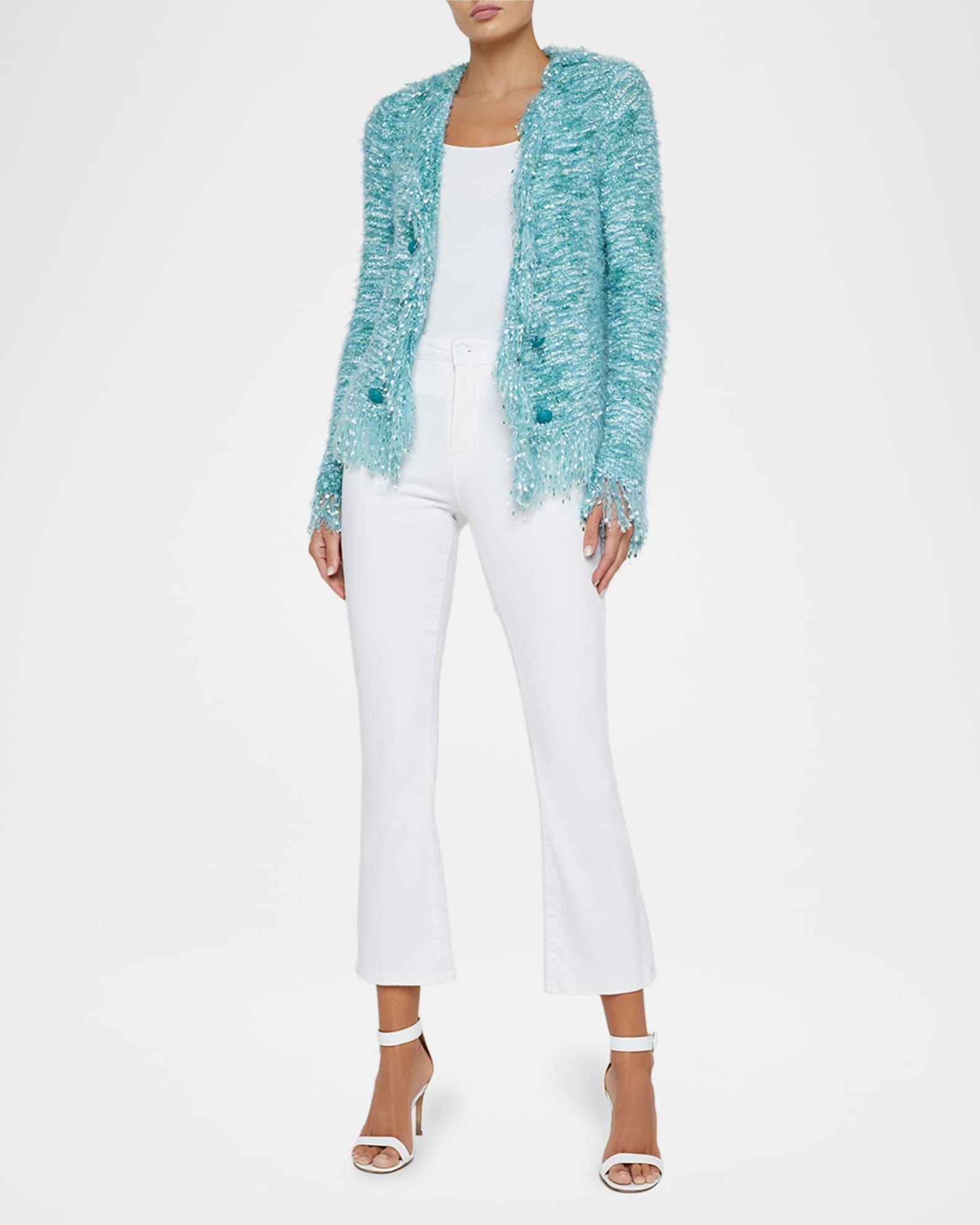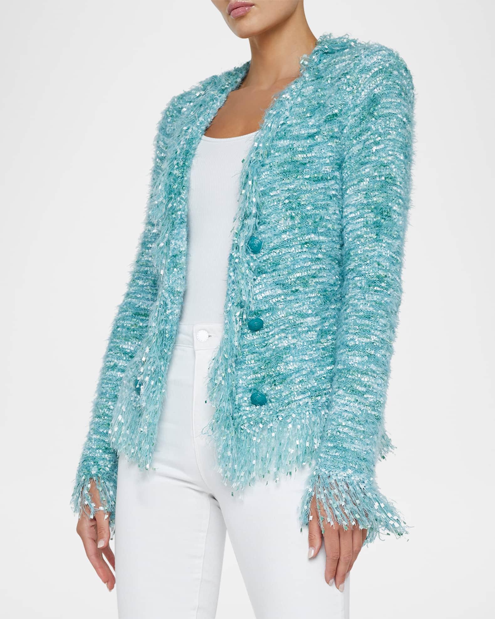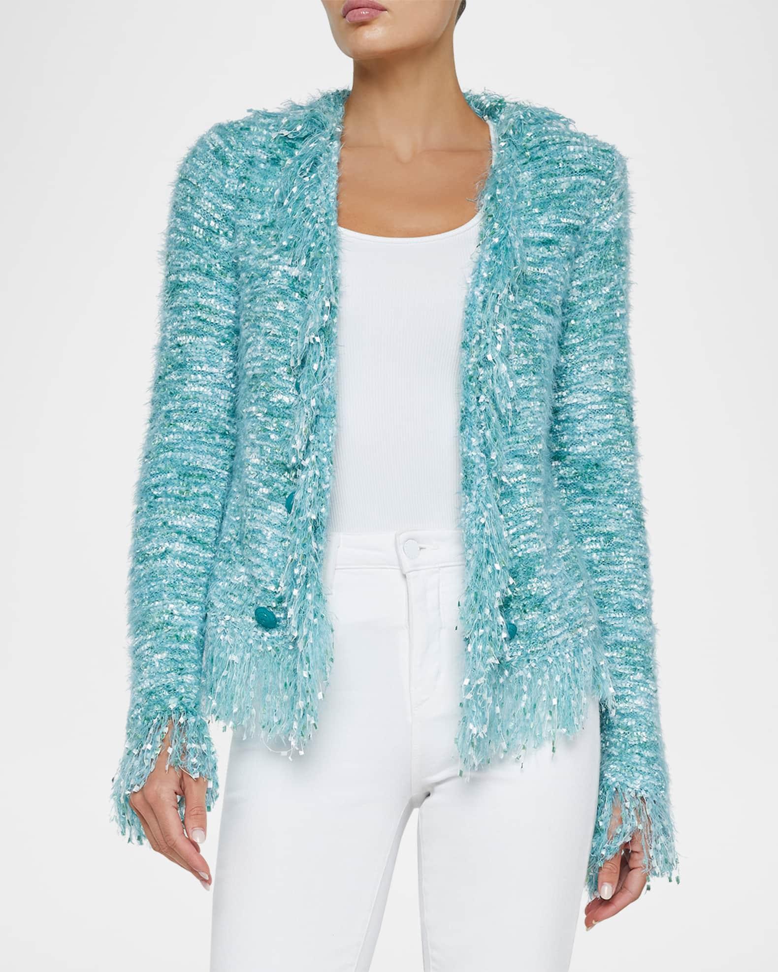 L'Agence "Azure" fuzzy cardigan blazer features fringe trim details and goldtone buttons Approx. 22.5"L from shoulder to hem  Open front  Long sleeves; approx. 19"L  Straight fit Polyester/nylon Unlined Dry clean Imported Model is 5'10"/177cm.