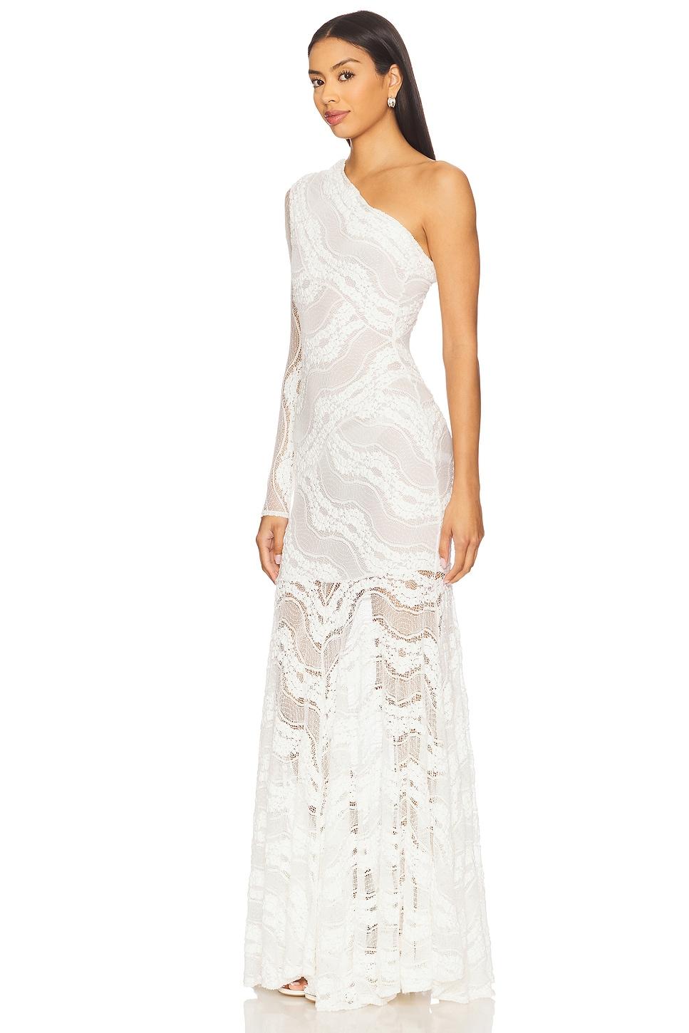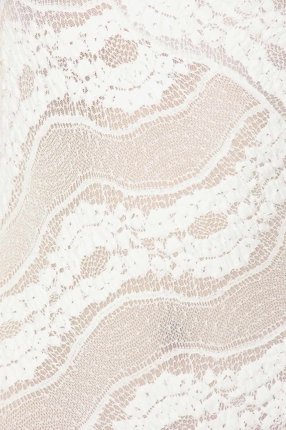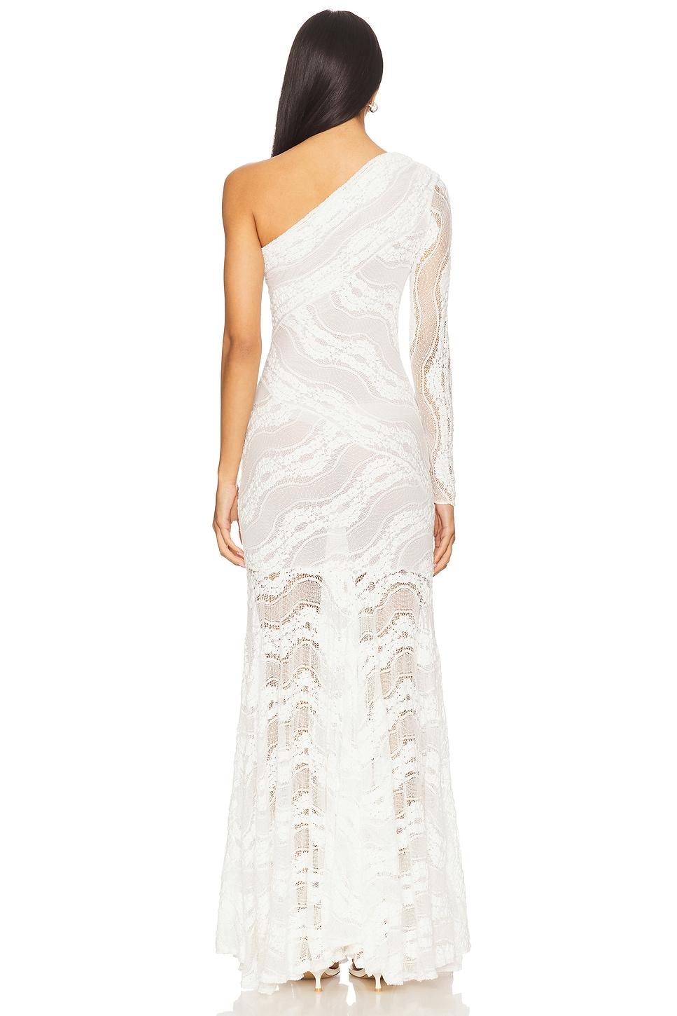 60% cotton, 32% polyamide, 8% spandex. Hand wash recommended. Unlined. Pull-on one shoulder styling. Stretch lace fabric. Made in Portugal. Revolve Style No. CRIB-WD185. Manufacturer Style No. 257612.
