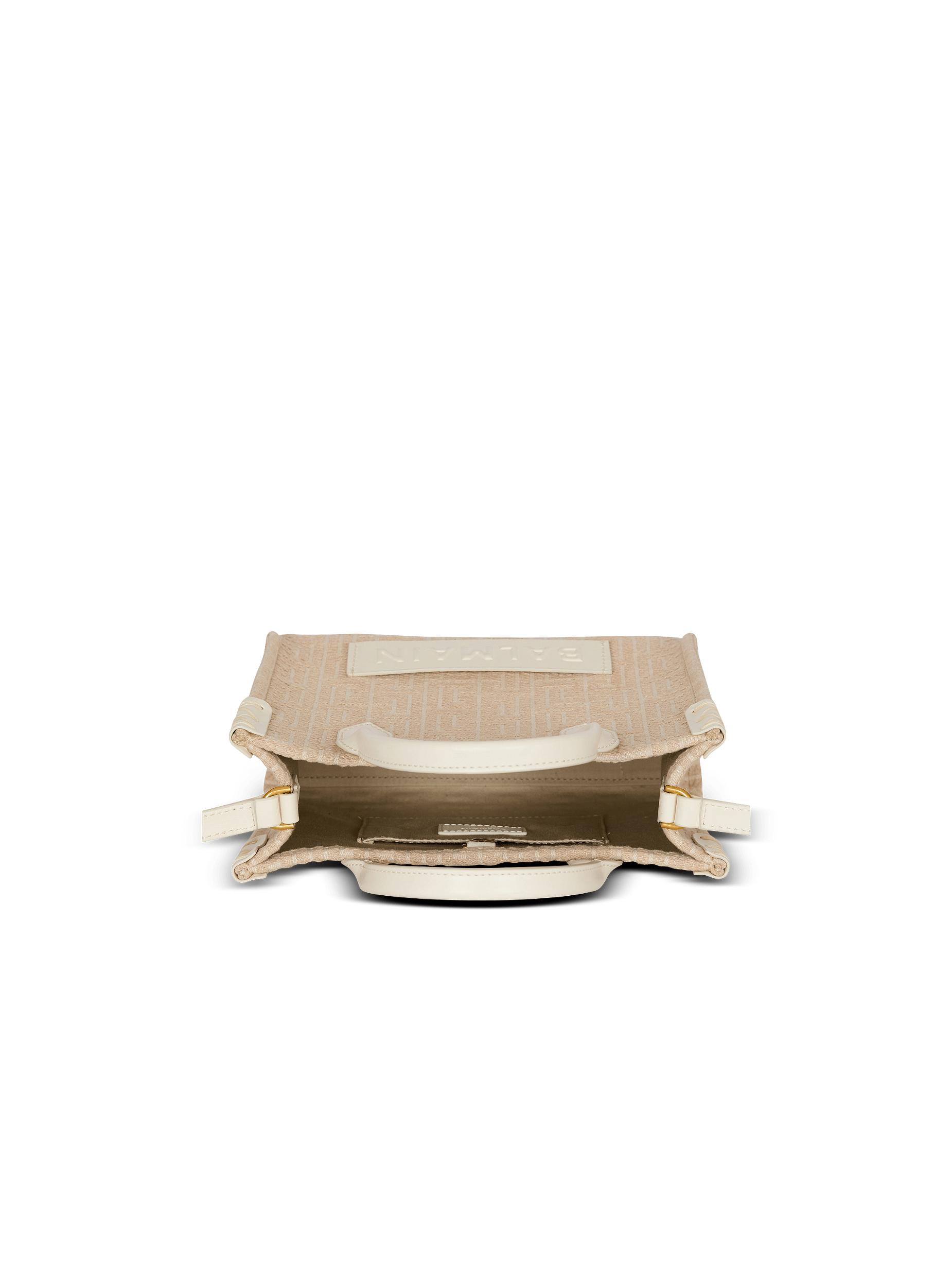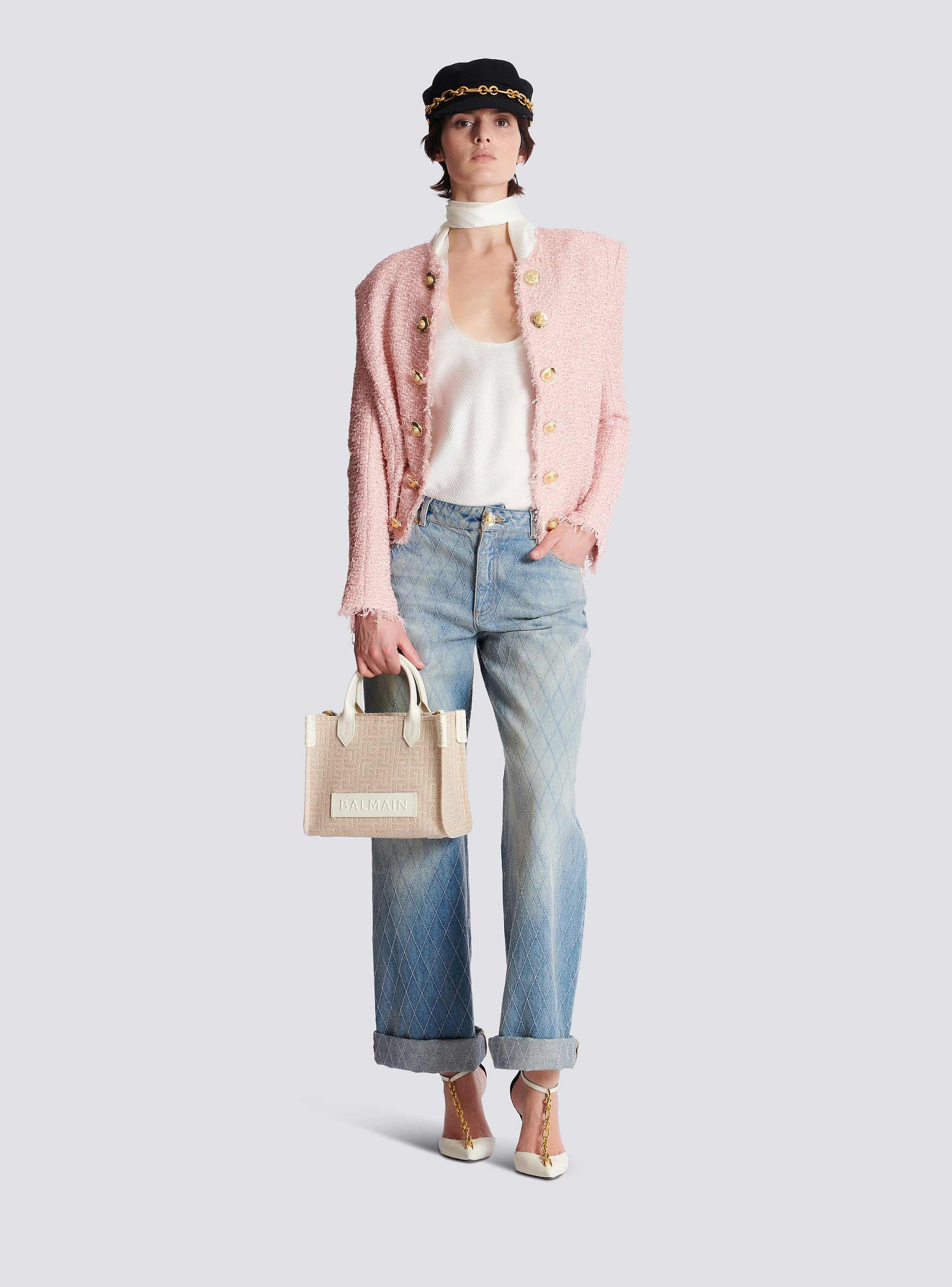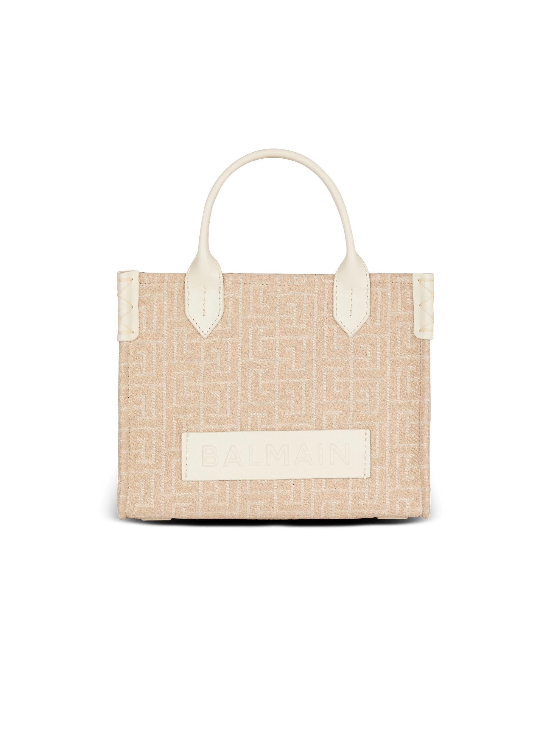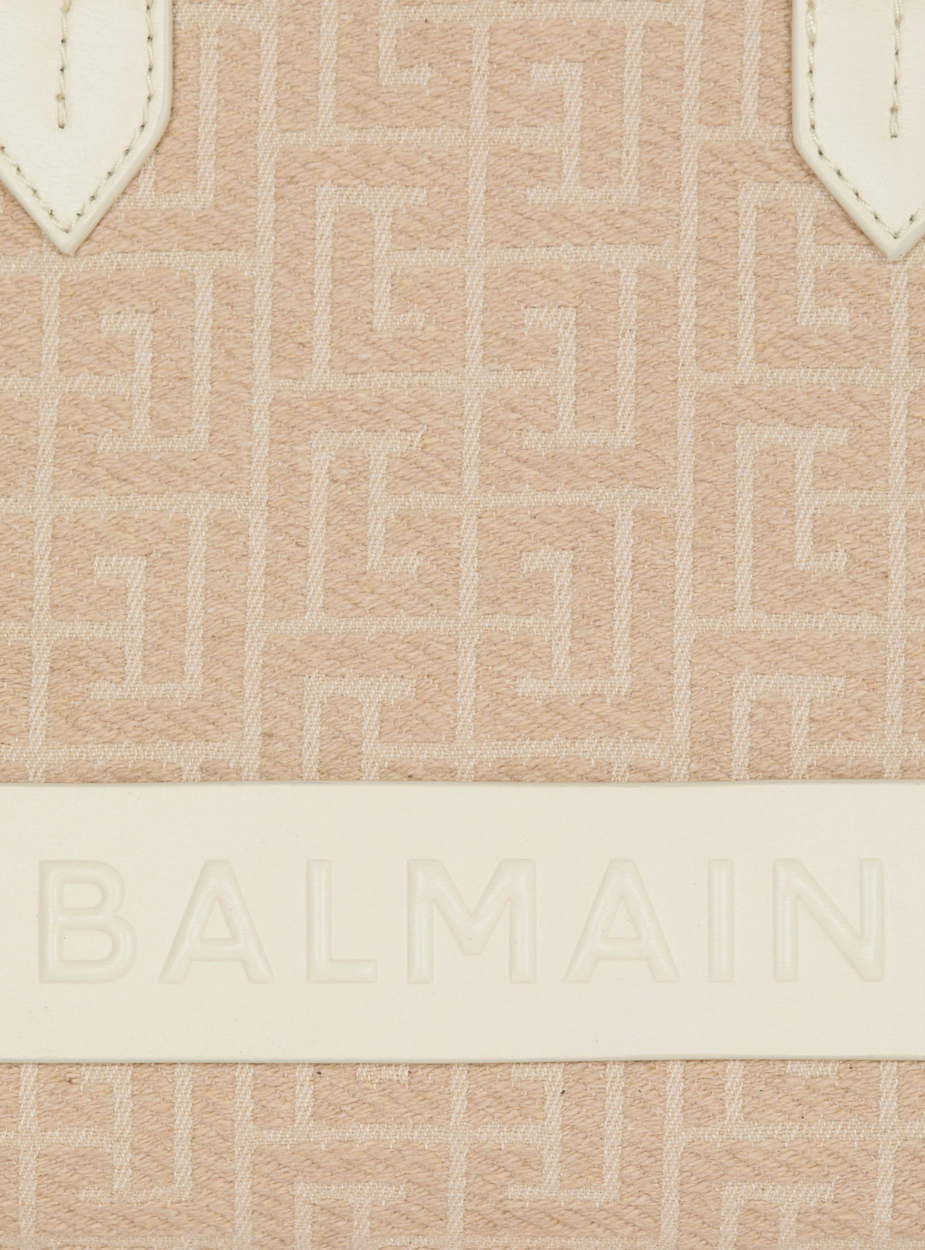B-Army Small PB-monogrammed jacquard canvas and calfskin leather tote bag Carry in the hand, on the shoulder or across the bodyBalmain logo in debossed leatherLeather details and tone-on-tone stitchingLeather handlesAdjustable leather shoulder strap with stud buttonsSnap hook closureCanvas inside pocket with embossed Balmain logoReinforced bottomLeather bag feetGold hardwareDimensions: 8.5 x 26 x 20.5 cmShoulder strap: 90 cmMain material: 87% cotton 13% linenMade in ItalyItem: FN1FE818TJSQ
