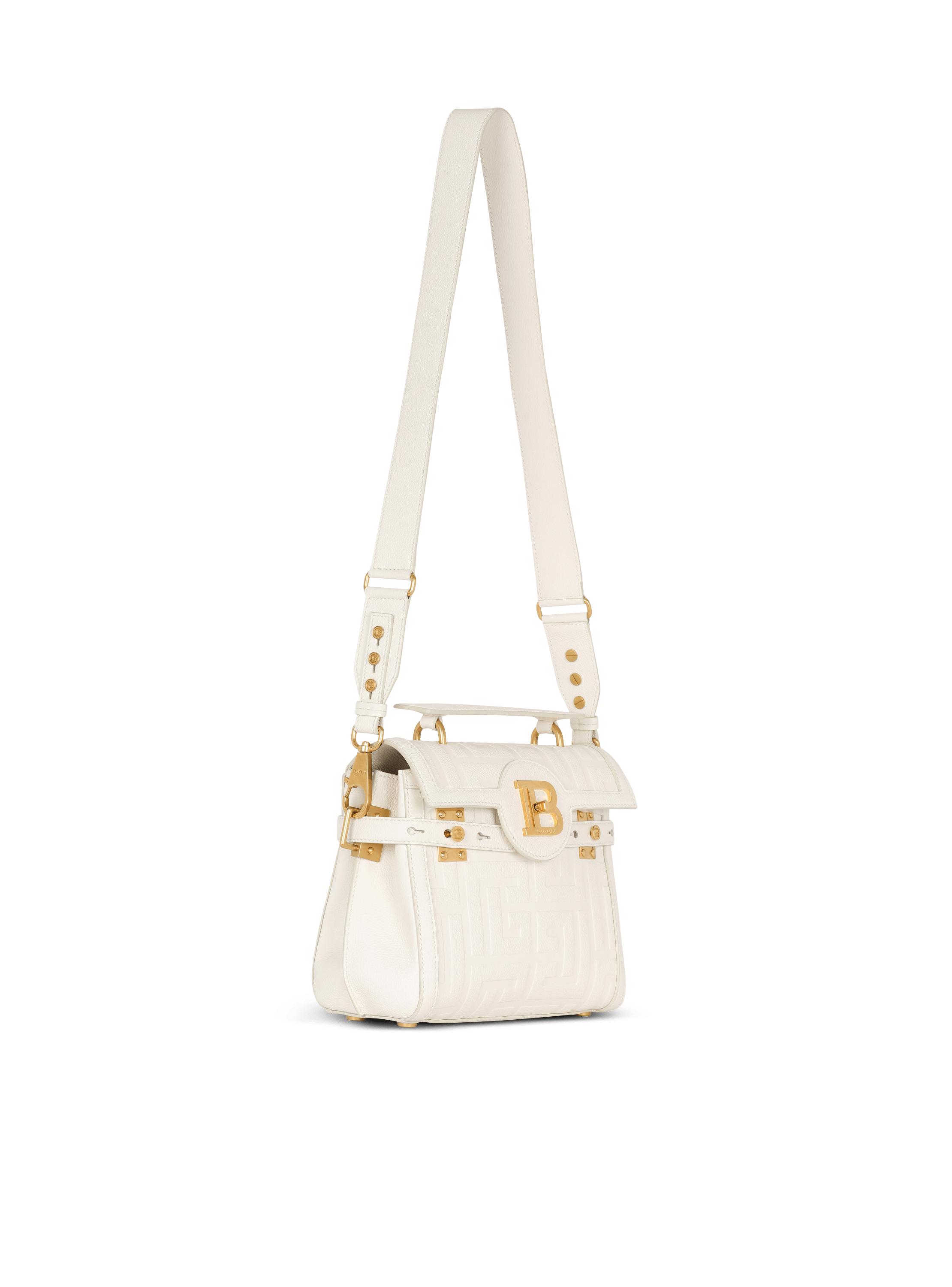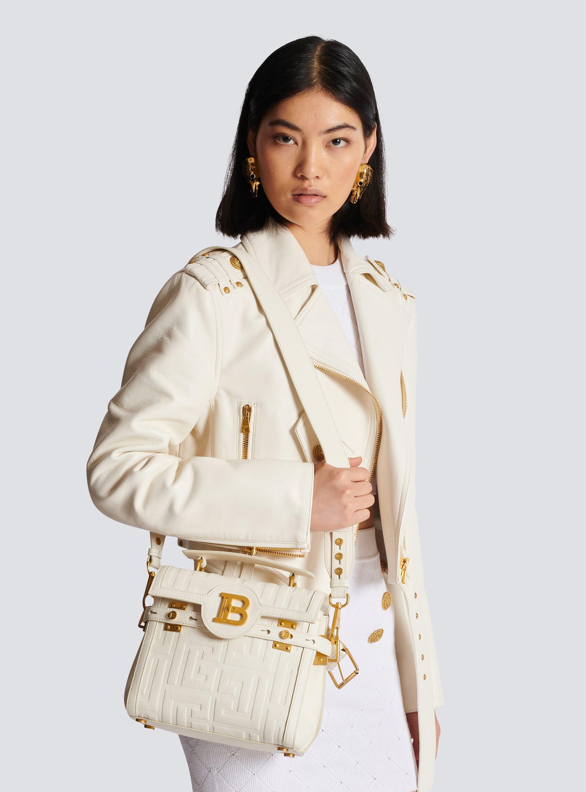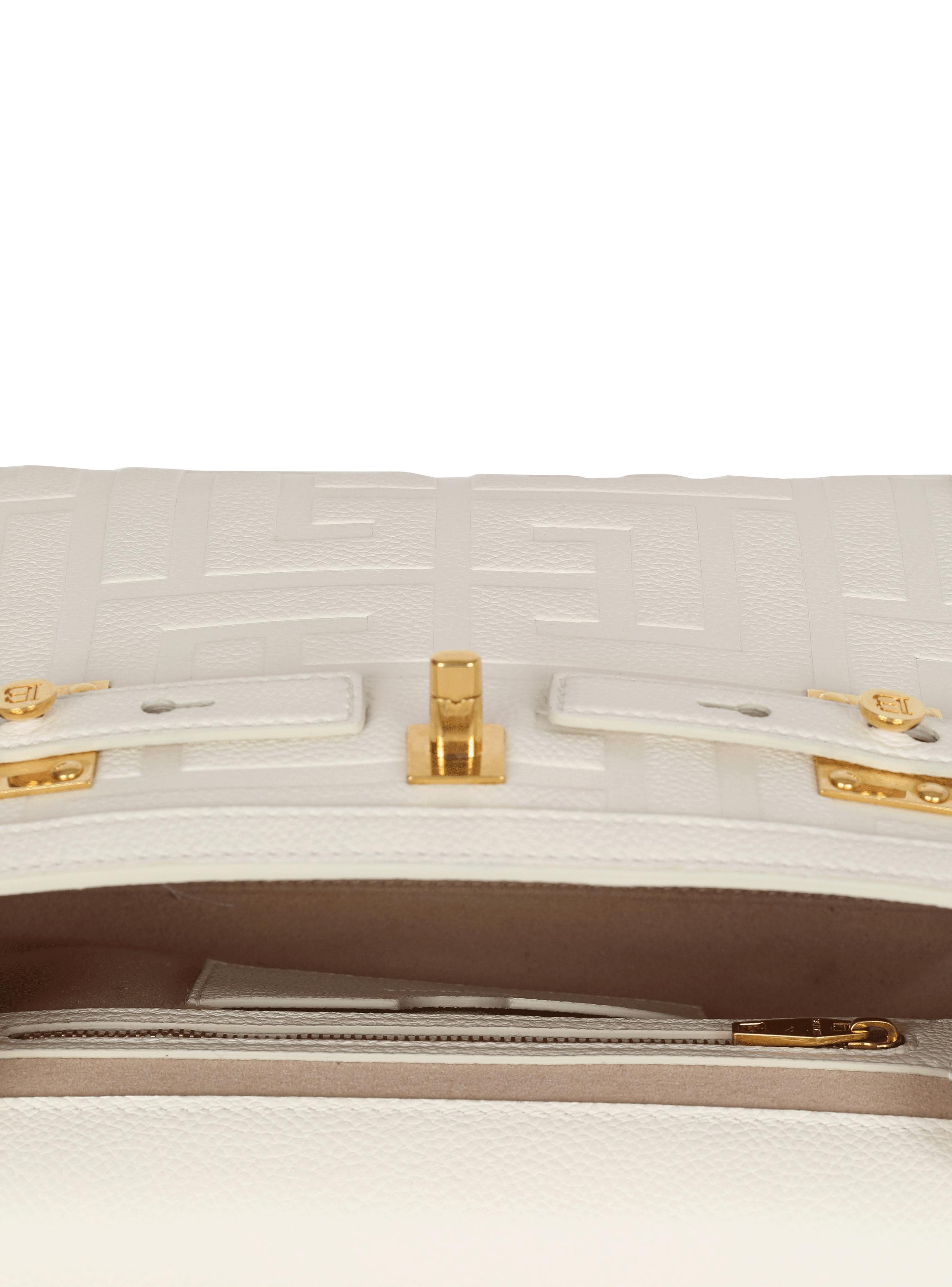 B-Buzz 23 monogram grained leather bagHandle and detachable shoulder strap with Balmain engraved snap hooksFlap with B-Twist quarter-turn claspPatch pocket at the backZipped pocket, card holder slot and embossed logo on the insideReinforced bottom and metal bag feetGolden hardwareComes with a protective coverDimensions: 23 x 20 x 11 cmMain material: 100% calfskin leatherMade in ItalyItem: CN1DB530LPGE