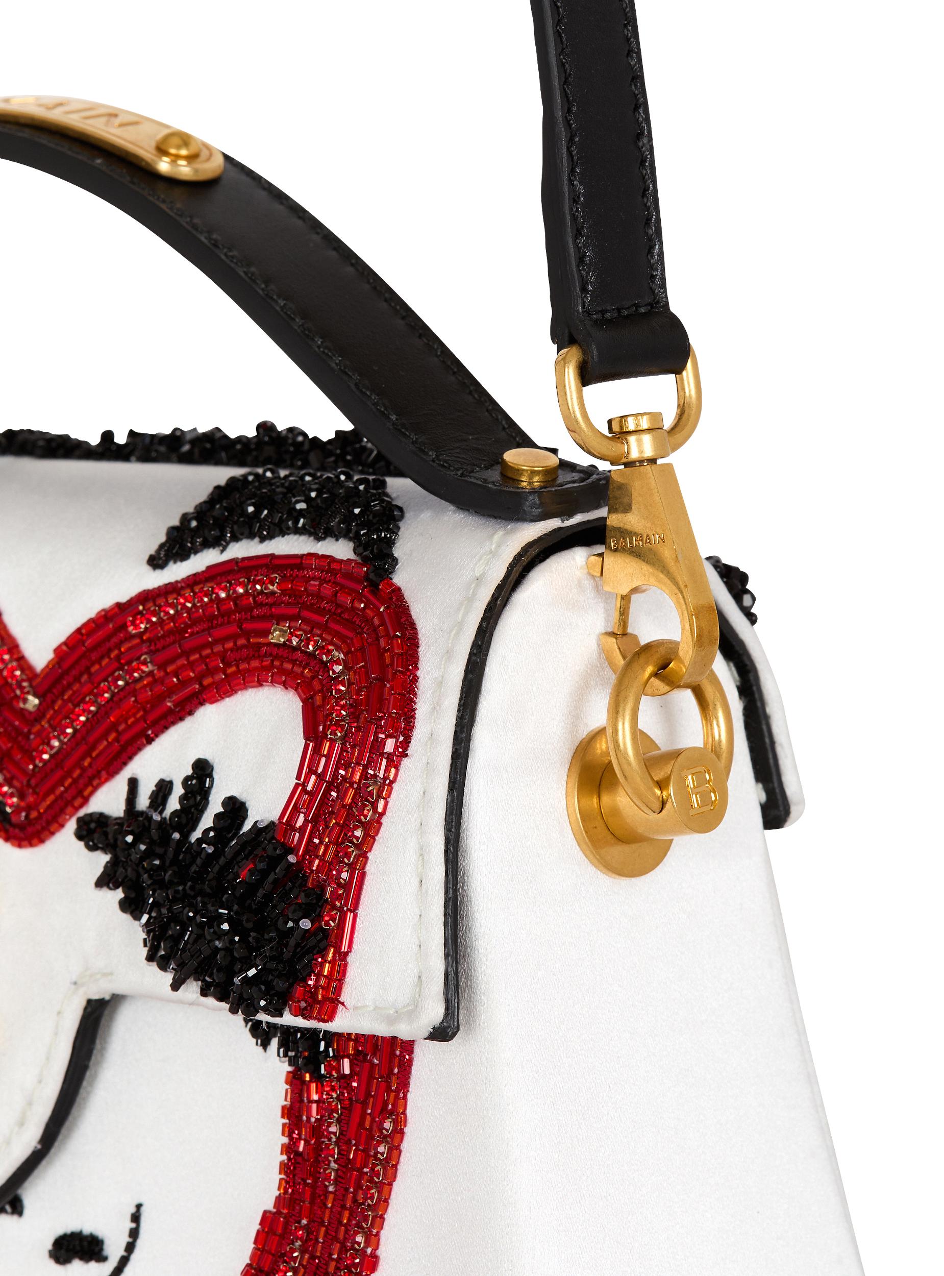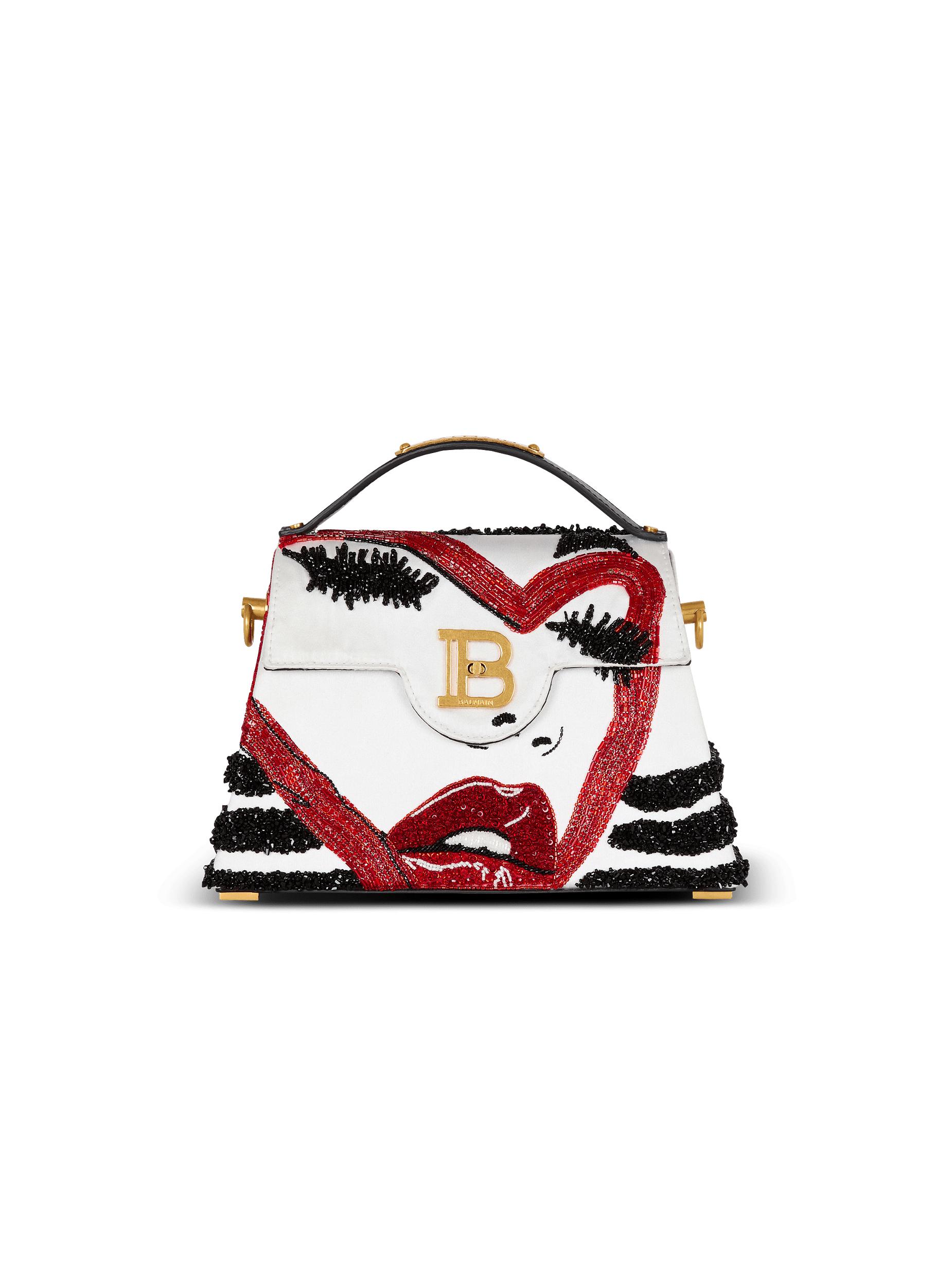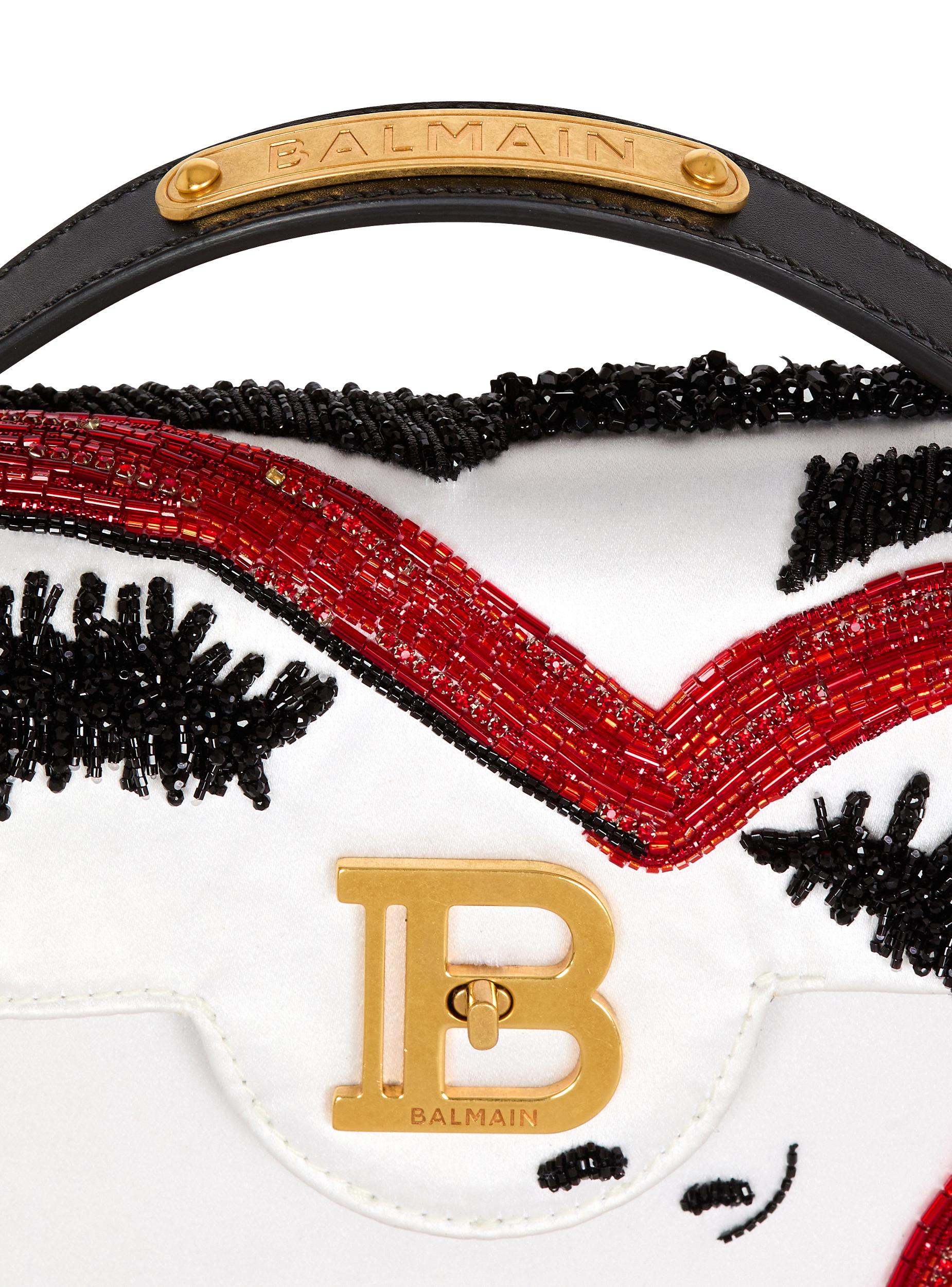 B-Buzz Dynasty Make Up bag in box leather and embroidered satinCarry in the hand, on the shoulder or across the bodyLeather handle, Balmain-engraved plaqueAdjustable and removable leather shoulder strap with snap hooksFlap with quarter-turn B-Twist claspMake-up motif embroidered with beads and crystalsInside zipped leather pocketEmbossed leather card pocketLeather liningLeather luggage tag with hidden mirrorMetal bag feetVintage gold hardwareDimensions: 23 x 16 x 7 cmShoulder strap: 100 cmMain material: 72% viscose 28% silkMade in ItalyItem: EN0DB935AHFA