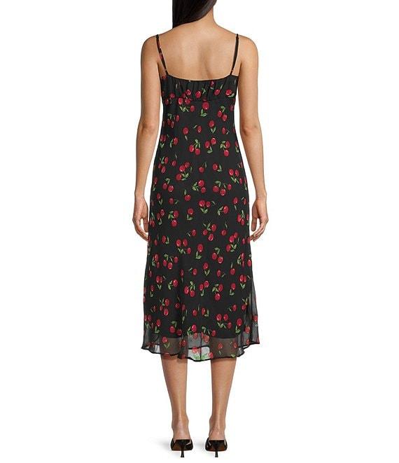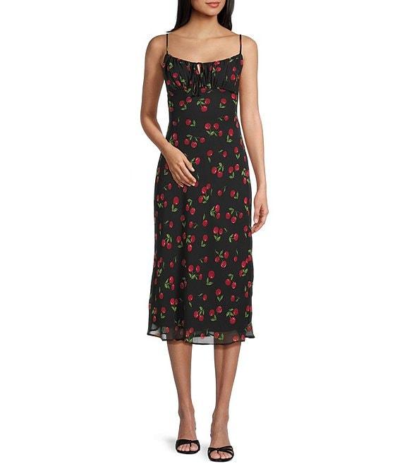From B. Darlin, this dress features: All over cherry print Tie-accented scoop neckline Sleeveless Adjustable spaghetti straps Midi skirt with ruffled hem 48" length Self and lining of polyester Machine wash/line dry Imported.